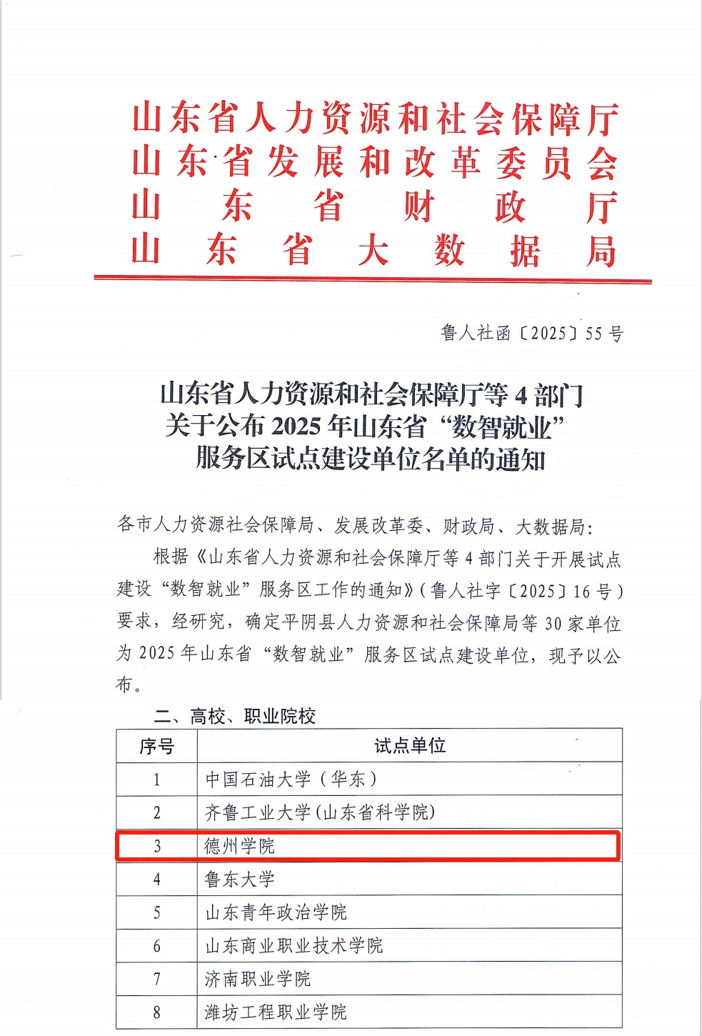 4月21日,山东省人力资源和社会保障厅等4部门公布2025年山东省“数智就业”服务区试点建设单位名单,确定了中国石油大学(华东)、齐鲁工业大学等5所本科高校为试点建设单位,beat365依托大学生就业创业赋能中心成功入围。