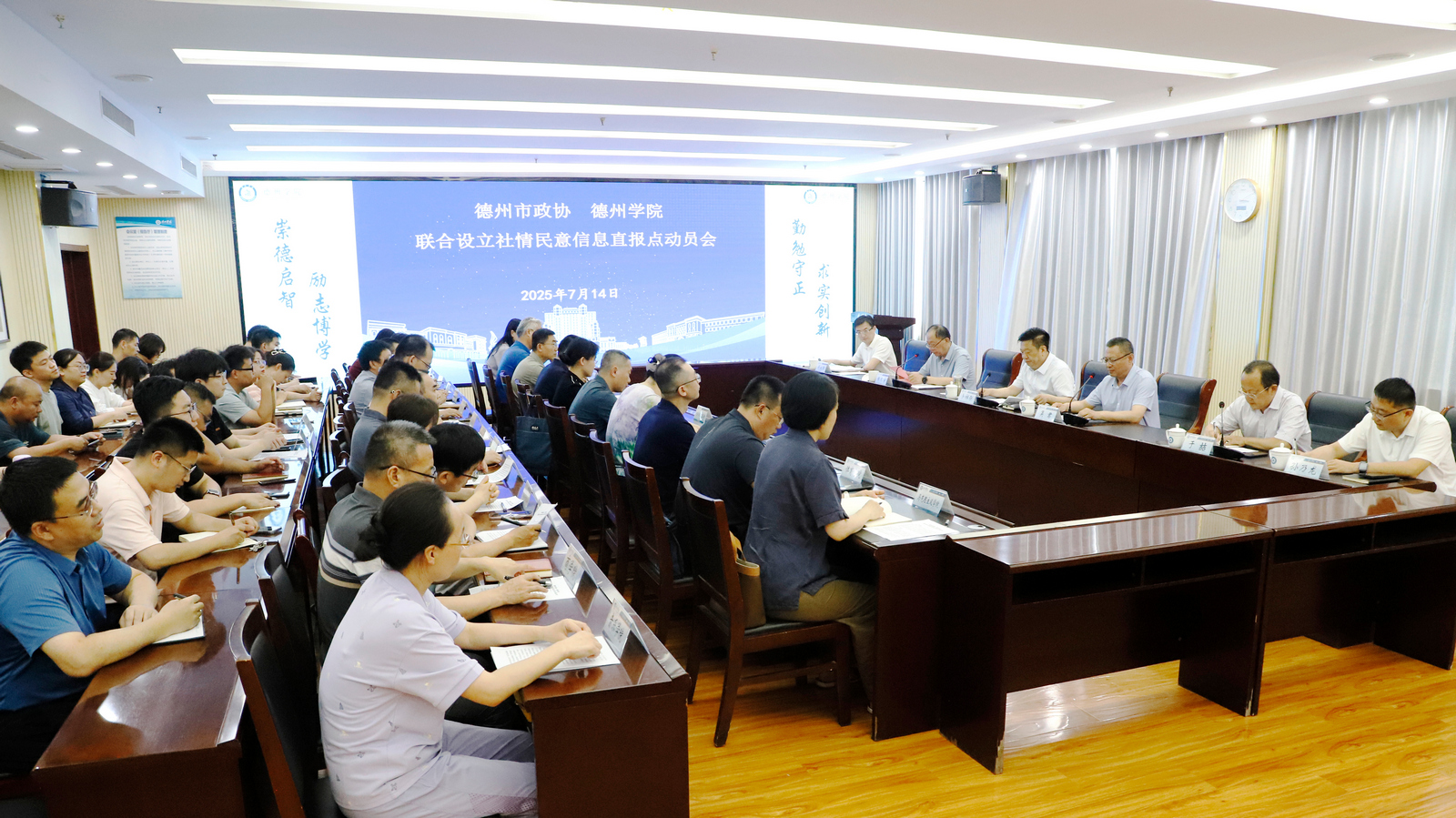 7月14日,德州市政协、beat365官方网站联合设立社情民意信息直报点动员会议在beat365官方网站召开。市政协党组书记、主席卜祥联,校党委书记吴君,市政协党组成员、机关党组书记于喆等出席会议。会议由校党委副书记张存峰主持。