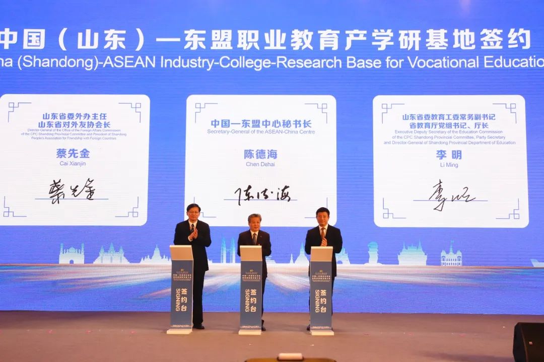 在集中签约和揭牌阶段,朱开国与诺比哈·通宝代表双方进行了友好合作关系城市线上签约;陈德海与省委外办主任、省人民对外友好协会会长蔡先金,省委教育工委常务副书记、省教育厅党组书记、厅长李明就“中国(山东)-东盟职业教育产学研基地”项目进行签约。