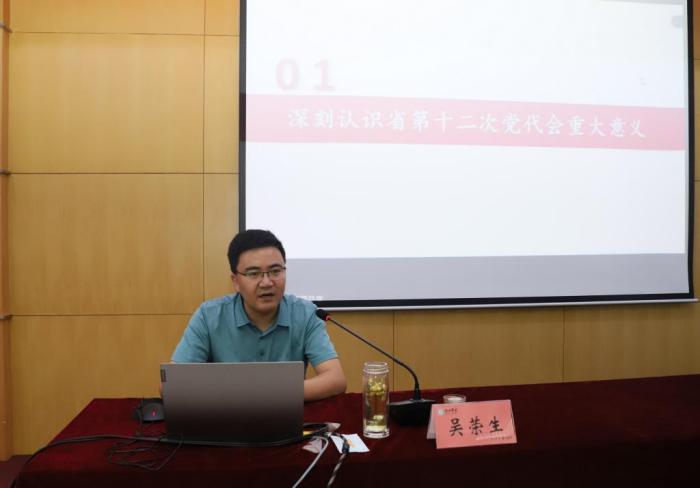 省委党校(山东行政学院)党的建设教研部主任吴荣生教授以《踔厉奋发 勇毅前行——深入学习贯彻省第十二次党代会精神》为题做专题报告,从深刻认识省第十二次党代会重大意义、准确把握会议精神、全面贯彻落实会议精神三方面对省第十二次党代会精神进行了深入的阐释。