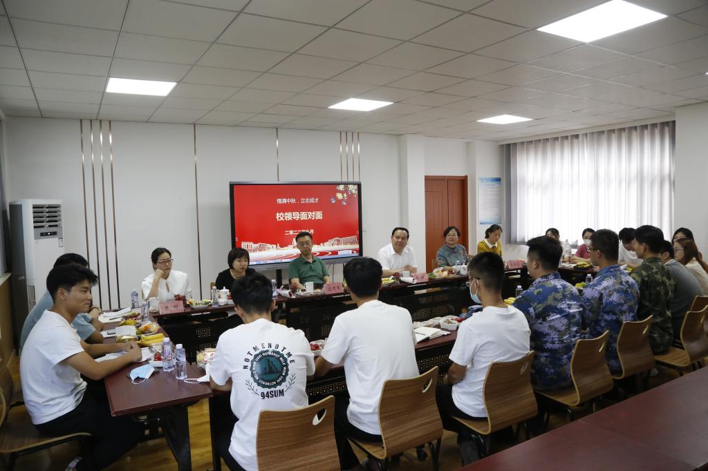 在温馨的氛围下,大家谈学习、聊生活、说理想、解困惑,进行了深入的交流。交流中,同学们分享了在校学习生活情况和成长经历,对学校老师的关心关爱表达了感恩之情。“新学期开学,德城区疫情防控的突发状况使我们的返校遇到了困难,辅导员老师得知情况后,主动联系我们尽心尽力帮我们解决困难,并督促我们按照疫情防控要求完成相关工作。针对疫情防控的突发状况,学校迅速反应,合理组织安排使我们很快能迅速返校,返校后学校为困难学生发放了临时补助,这解决了我的现实困难,我感谢学校领导、老师、志愿者同学的关心帮助。”2019级文学与新闻传播学院杨家校说。2019级能源与机械学院的张婉莹说:“在老师的鼓励和带领下加入了科创项目,实践了所学的专业知识,也学会了沉着冷静、灵活应变。从最初的怯场、不够好到如今的淡定、从容,是学校为我提供了展示和锻炼的平台,是老师对我悉心指导,让我成为更好的自己。”。退伍士兵2021级法学院殷国鑫分享了个人入伍的经历。他说,从蓝色军营到多彩校园,我更加深刻的感受到了做为一名在校大学生,学习是一件多么甜蜜和幸福的事情。我将同全校58名军训教官一起全心全意服务学校2022级新生军训工作,齐心协力带领新生发扬“不怕苦、不怕累”的艰苦奋斗精神,为新生军训任务交上满意答卷,以崭新的姿态和优异的成绩迎接党的二十大胜利召开。