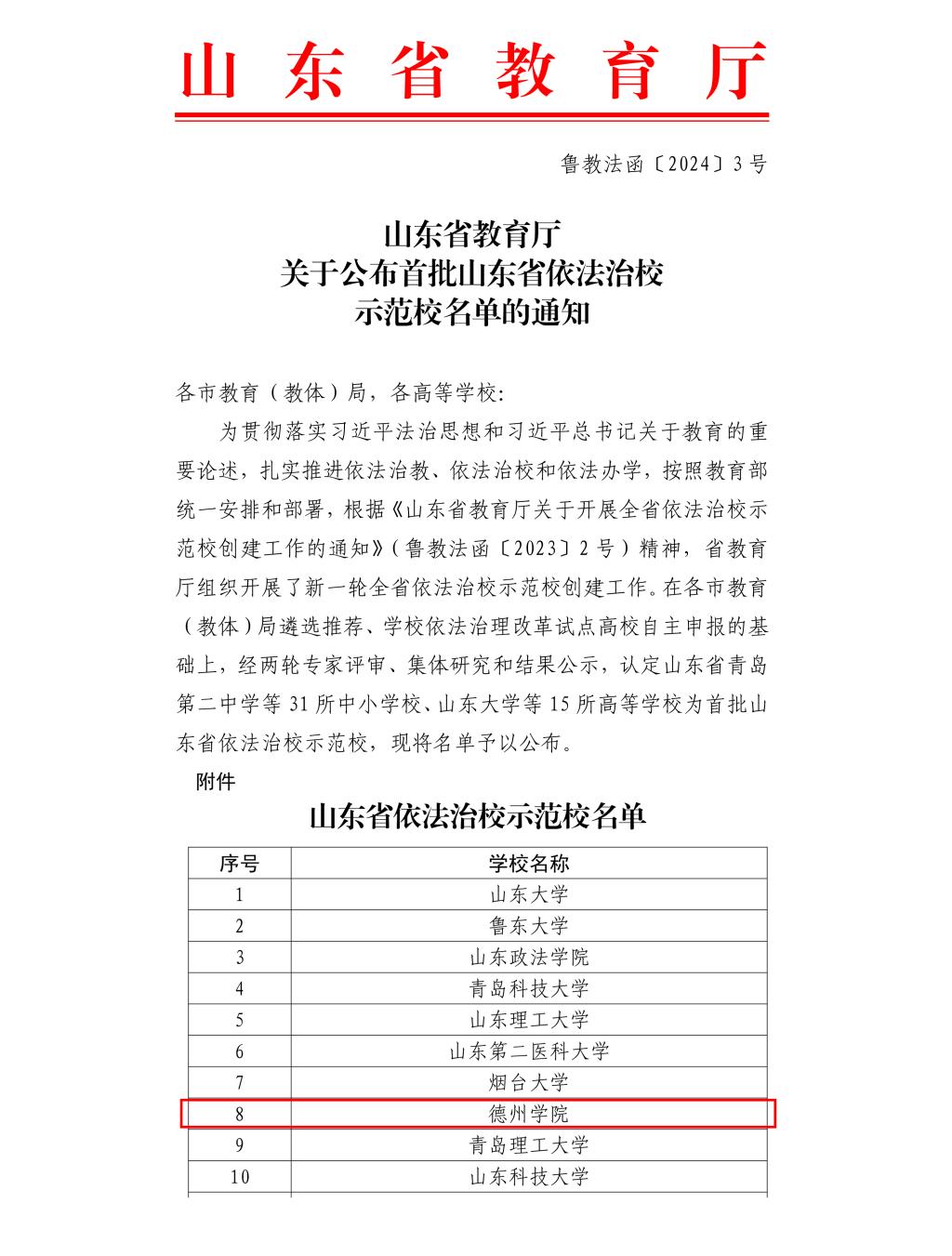 近日,省教育厅印发《山东省教育厅关于公布首批山东省依法治校示范校名单的通知》(鲁教法函〔2024〕3号),beat365官方网站被认定为山东首批依法治校示范校,全省15所高等学校入选。学校始终注重战略规划、内部治理、机构建设、放管服改革和宣传教育,切实将依法治理融入学校工作全过程和各方面,在全面推进依法治校、构建现代大学治理体系方面取得显著成效。学校团委也被确定为全国“八五”普法中期表扬单位推荐对象。