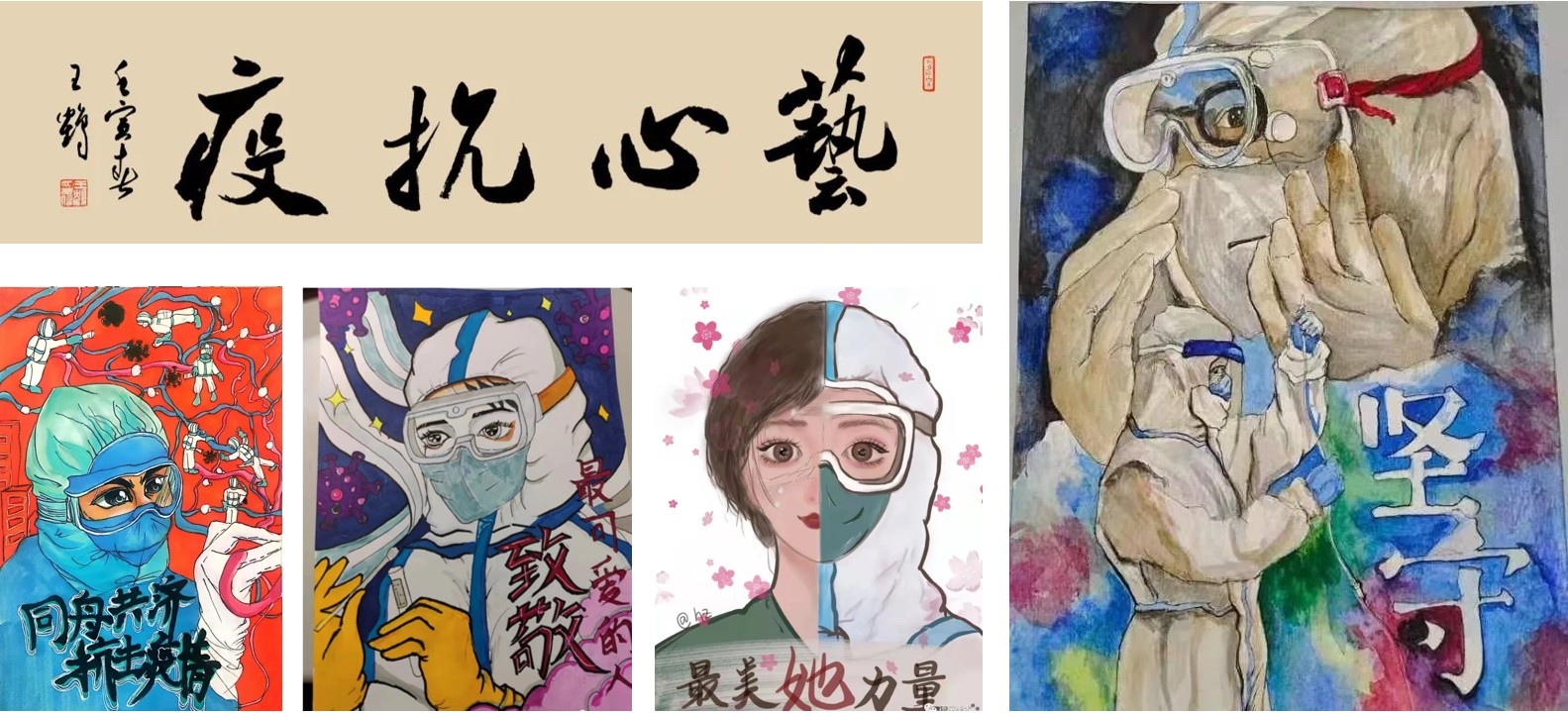 各学院还以文艺作品的形式助力学校疫情防控。他们中,有的以绘画的方式,讲述生动的抗疫故事,定格感人的抗疫瞬间,谱写动人的抗疫赞歌;有的录制原创抗疫歌曲,用歌声助力抗疫第一线;有的通过录制抗疫手势舞,为战“疫”加油……相信疫情终会过去,春天必会到来。
