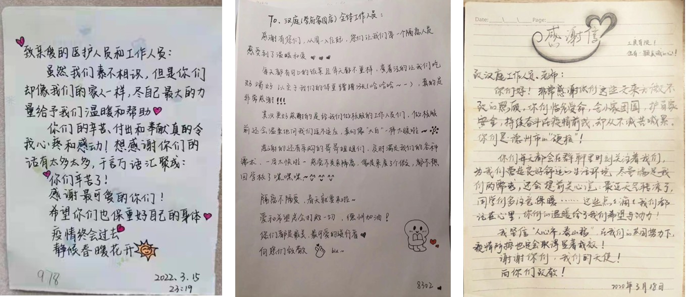 “尊敬老师:非常感谢你们连日来无微不至地照顾,你们临危受命,舍小家团圆,护百家平安,你们的温暖给了我们希望和动力!向你们致敬!”同学们写下一封封感谢信、录制了一段段感谢的视频、道出了一句句感谢的话语,表达对党和政府、学校和社会各界、老师和工作人员的感激之情。