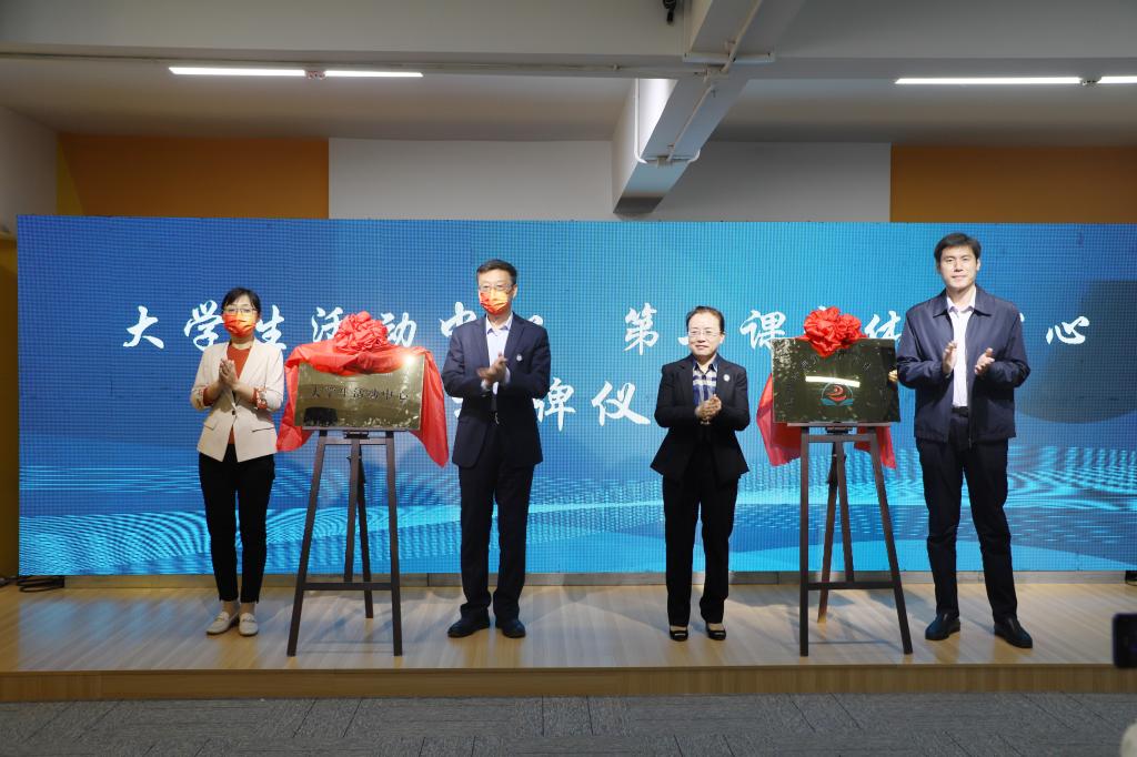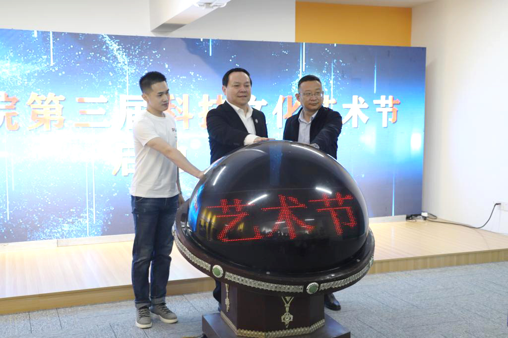 车滨、徐慎宝、何志城共同点亮启动球,第三届科技文化艺术节正式拉开序幕。迟沂军、张方瑞为大学生活动中心揭牌,徐静、崔航为第二课堂体验中心揭牌。