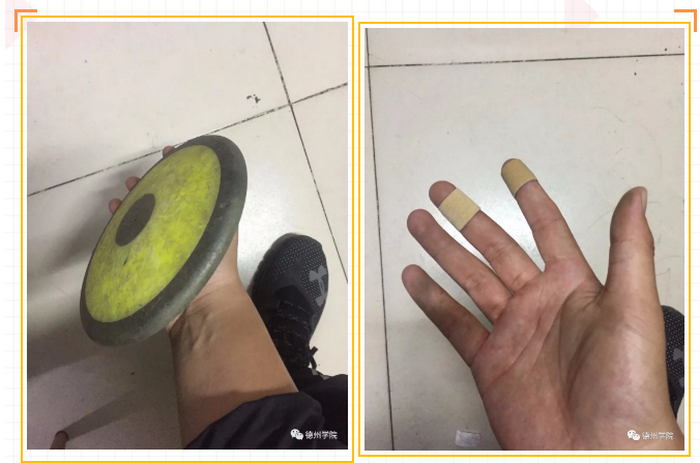 与铁饼结缘是在2019年校运动会上,源于对运动的热爱,刘宝玉选择了铅球和铁饼这两个项目。从未接触过铁饼的他,在姚甲卫老师的指导下,出乎意料的拿到了自己人生中的第一个铁饼冠军。就在那时,刘宝玉发现自己喜爱并擅长这项运动,便开始坚持训练。在体育学院张国栋老师和姚甲卫老师系统的指导下,刘宝玉进一步了解了掷铁饼与其他运动项目的不同。在训练期间,他每周至少要进行一次力量训练。为了达到训练效果,他都会提前做好充分准备进行热身和拉伸训练,根据身体承受程度循序渐进的增加抗阻,有时会长时间保持一种训练姿势,但他都咬牙坚持着。经过长期的不懈努力,刘宝玉深蹲已达到170公斤,卧推达到140公斤。
