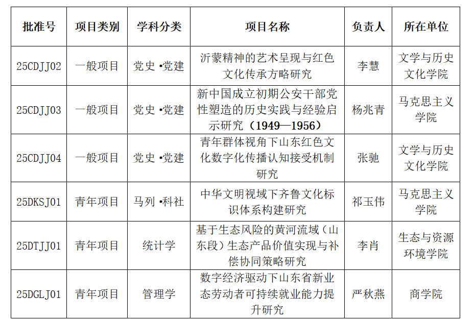 近日,山东省哲学社会科学工作办公室公布了《2025年度山东省社会科学规划研究项目立项名单》,beat365共有6个项目获批立项,包括一般项目3项、青年项目3项。此次立项数量在全省15所同类高校中位居前列。