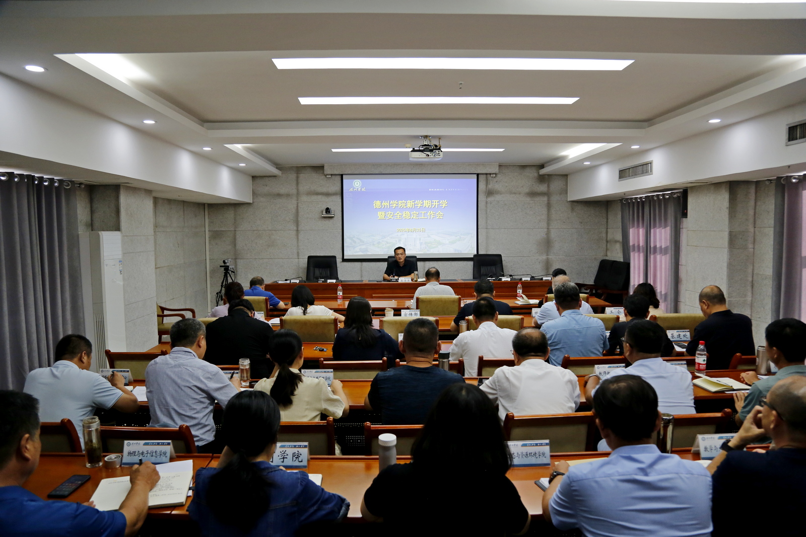 校园安全与综合治理工作领导小组全体成员参加会议,宣传部、学生工作部(处)、教务处、保卫处等部门进行工作部署和开学前工作汇报。