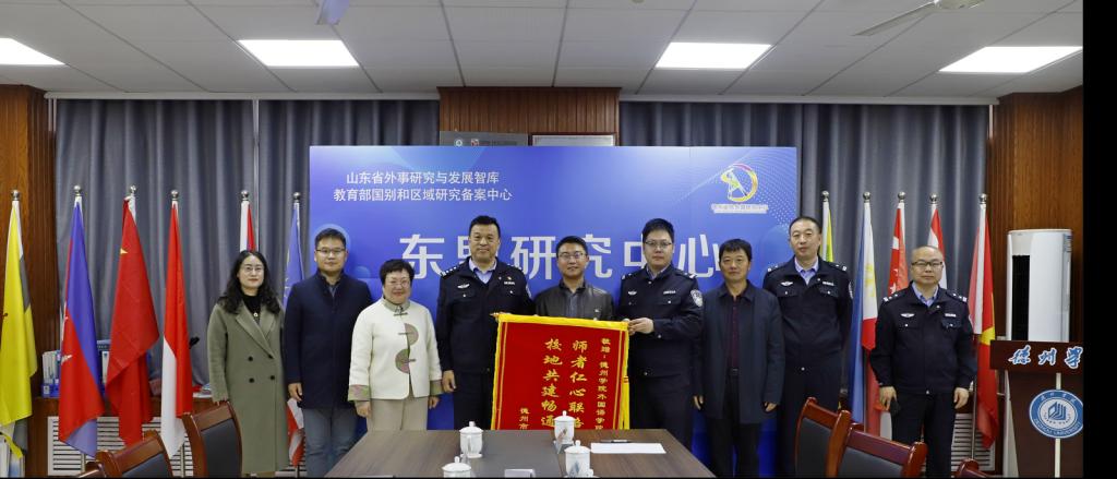 10月31日,德州市公安局陵城分局副局长兰江一行到访beat365官方网站,向东盟研究中心赠送“师者仁心联络专业资源 校地共建畅通译使之路”锦旗。学校党委委员、宣传部部长冯琨参加。