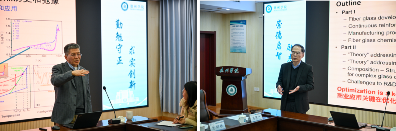 座谈会结束后,岳远征以《我的玻璃之缘》为题作学术报告,结合自身数十年科研经历,分享了与玻璃材料领域结缘的历程、关键研究节点的突破故事,以及玻璃材料在前沿科技领域的创新应用方向;李洪围绕《玻璃纤维制造技术及新产品开发中的挑战》展开汇报,系统分析了当前玻璃纤维制造行业的技术现状、核心工艺难点,重点剖析了新产品开发中面临的材料性能优化、绿色生产转型、市场适配性等关键挑战,并提出了针对性的解决思路与技术路径。两位专家的报告内容翔实、深入浅出,为在场师生带来了一场兼具理论高度与实践指导意义的学术盛宴。报告后,在场师生与专家进行了深入交流,现场互动氛围热烈。