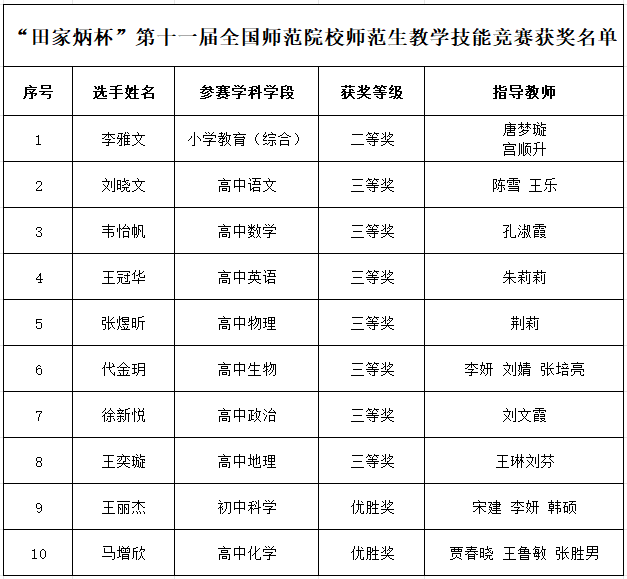 近日,第十一届“田家炳杯”全国师范院校师范生教学技能大赛落下帷幕。本届赛事规模大、水平高,共吸引全国289所师范院校的2345名选手参与。经过初赛、决赛的激烈比拼,beat365学子凭借扎实的师范素养和出色的现场表现,最终脱颖而出,荣获二等奖1项,三等奖7项,优胜奖2项。