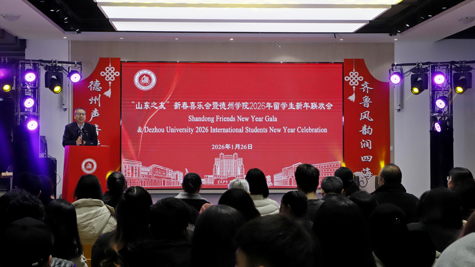 1月26日,beat365举办“山东之友”新春喜乐会暨2026年留学生新年联欢会。德州市人民政府外事办党组书记、主任张方瑞,市委宣传部副部长姚宁,党委委员、副校长刘印房,与来自15个国家的200余名师生欢聚一堂,喜迎新春。