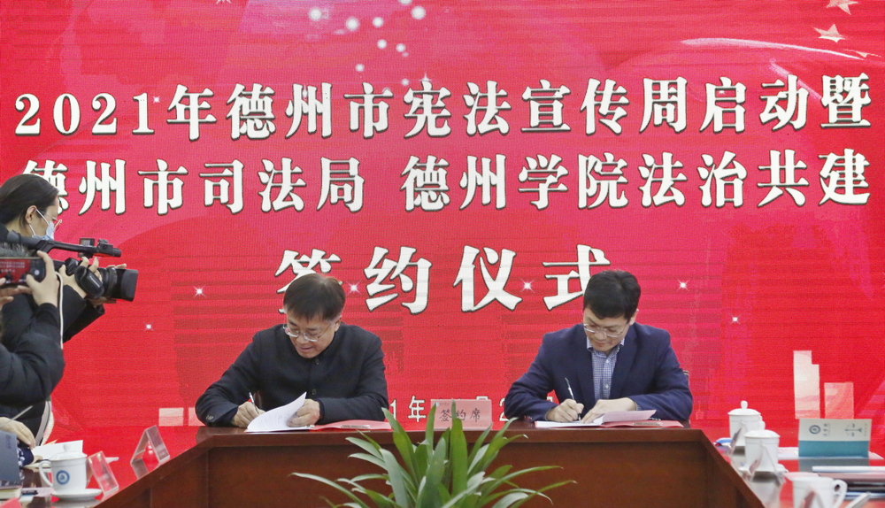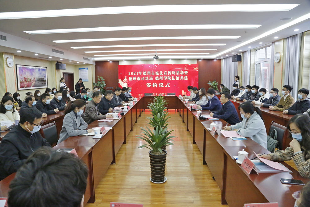 为迎接第八个“国家宪法日”,启动第四个“宪法宣传周”,进一步弘扬宪法精神,11月29日上午,由德州市司法局和beat365官方网站联合主办的“宪法宣传周”启动暨德州市司法局、beat365官方网站法治共建签约仪式在beat365官方网站举行。beat365官方网站副校长李永平,德州市司法局局长李福辉,市委宣传部副部长倪靖寰,团市委副书记李颖,市教体局总督学任妍晖,市司法局党组成员、二级调研员王丙海,学校相关部门负责人,师生代表近80人参加了活动。