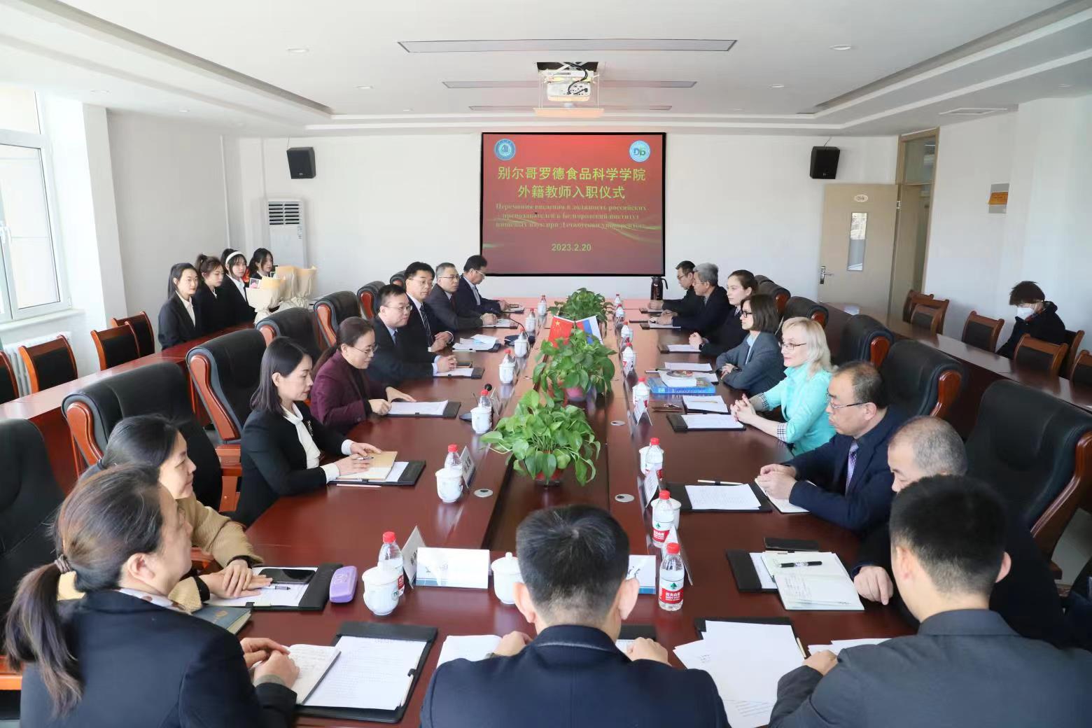 为认真贯彻落实《中华人民共和国中外合作办学条例》及其《实施办法》,高质量推进别尔哥罗德食品科学学院建设,2月20日,首批外籍专家入职仪式在健行楼二楼会议室隆重举行。校长赵长林、副校长李永平应邀参加入职仪式,副校长兼别尔哥罗德食品科学学院院长徐静,人事处、教务处、科研处、国际交流合作处、后勤管理处、资产管理处、网络与教育技术中心、化学化工学院、生命科学学院、别尔哥罗德食品科学学院相关负责人和俄罗斯别尔哥罗德国家研究型大学专家祖巴列娃·叶卡捷琳娜、塔拉申科·叶夫根尼亚、维尼琴科·玛丽亚出席入职仪式。仪式由李永平主持。