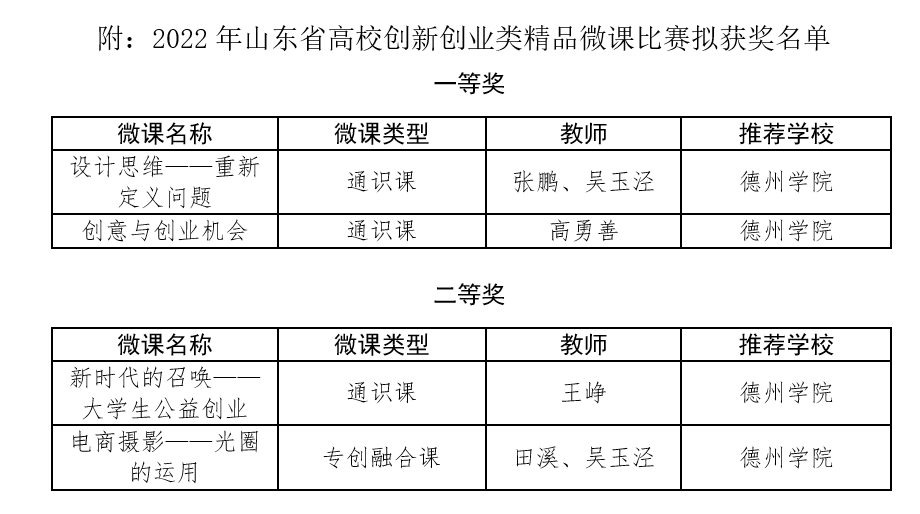 近日,省教育厅公示了山东省高校创新创业类精品微课比赛拟授奖名单,beat365创新创业学院组织推荐的4门创新创业类微课程获得一等奖2项、二等奖2项。