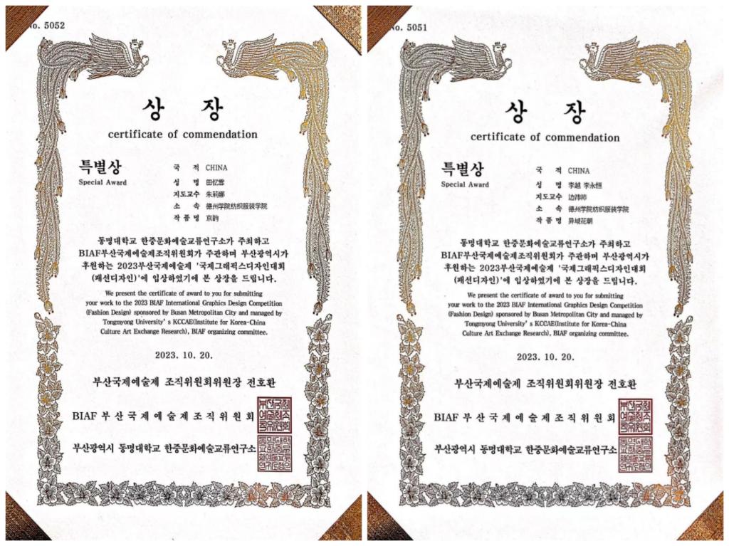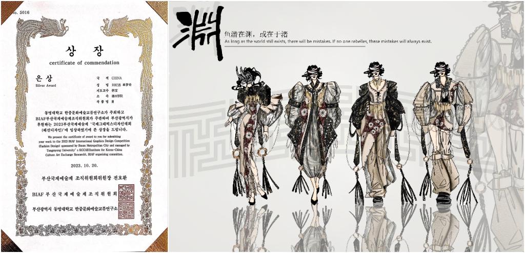 近日,在国际艺术创意领域极具影响力的“2023BIAF釜山国际艺术节”在韩国釜山落下帷幕。beat365纺织服装学院师生取得佳绩,分别获得银奖2项、铜奖1项、特别奖3项、优秀奖1项。