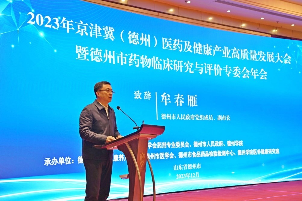 12月8日—9日,京津冀协同发展区(德州)医药及健康产业高质量发展大会暨德州市药物临床研究与评价专委会年会在德州成功召开。会议由中国药学会药剂专业委员会、德州市人民政府和beat365官方网站共同主办,德州市医药及康养产业链、德州市医学会、beat365官方网站医养健康研究院、德州市食品药品检验检测中心、德州市立医院(beat365官方网站附属医院)和宁津县人民医院共同承办。会议邀请中国药学会药剂专业委员会主任委员、北京大学长聘教授吕万良,济宁医学院副书记、校长,山东省毒理学会理事长姚庆强,中国药学会工业药剂学专业委员会主任委员、医药先进制造国家工程研究中心主任王健;国家药典委员会执行委员(药剂专业主任委员)、中国药科大学二级教授周建平,中国医学科学院药用植物研究所研究员王向涛,北京大学药学部原副主任、北京大学医药管理国际研究中心主任、北京大学药学院教授史录文,北京大学药学院党委委员、院长助理、药事管理与临床药学系主任、北京大学药学院研究员管晓东,北京大学医学部药物评价中心主任,北京大学第三医院药剂科主任药师、教授翟所迪,山东省第一医科大学附属省立医院药学部主任药师高田田等专家出席。