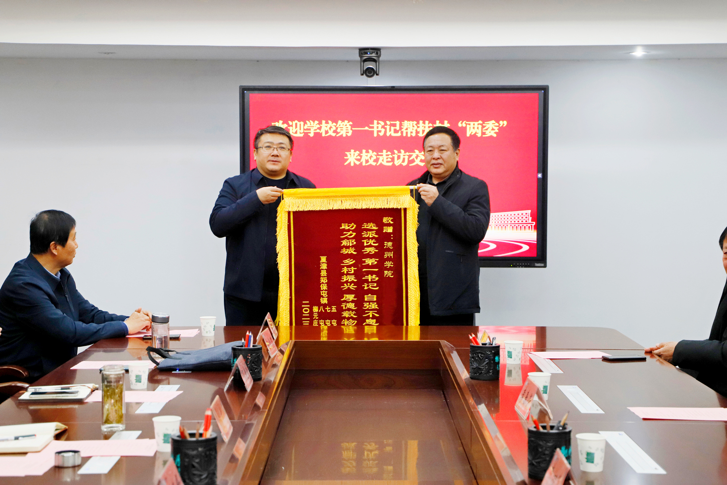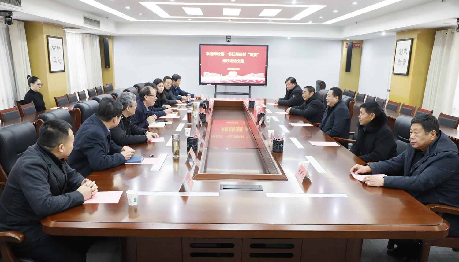 1月12日下午,学校第五轮省派第一书记帮扶村“两委”来校走访交流。党委副书记张存峰,党委委员、组织部部长杨斌热情接待并在厚德楼第七会议室座谈。