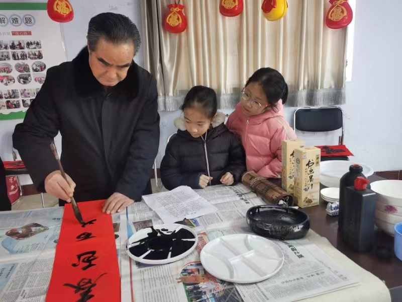 活动现场,红纸翻飞、墨香四溢。退休老师挥毫泼墨,隶行楷草各显神韵,妙语佳句跃然纸上,一幅幅饱含美好祝福的春联和一个个充满勃勃生机的“福”字,送到居民手上。“听说社区有送春联活动,我早早就来了!我一直有个心愿,家里有写好的‘福’和‘寿’,添个‘禄’字就好了,书法老师专门为我写了‘禄’字,真是太高兴了!”居民张大妈手持自己心仪的“禄”字,高兴地说。爱好书法的小朋友,满心欢喜来到书法老师身边观摩,一边欣赏一边学习。