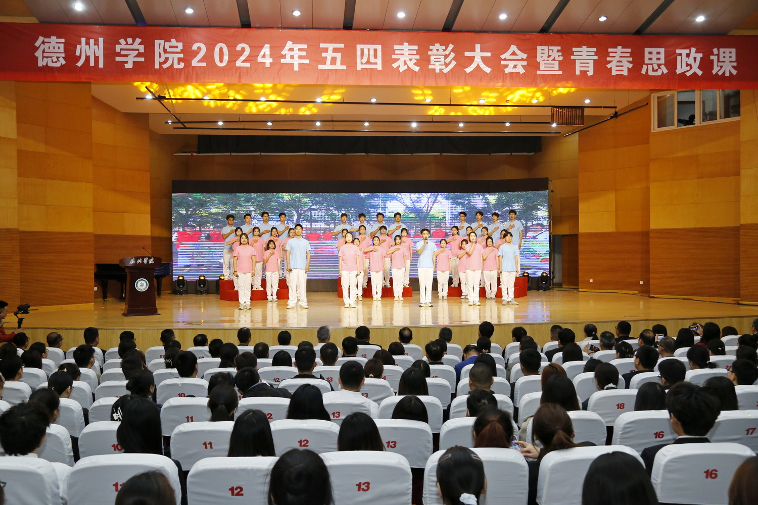 与会人员还共同观看了原创情景朗诵《我们的青春》。学校相关职能部门副处级以上干部,各学院党委书记、副书记、团委书记及全体辅导员,各学院学生会、学生社团负责人及学生代表共计400余人参加大会。