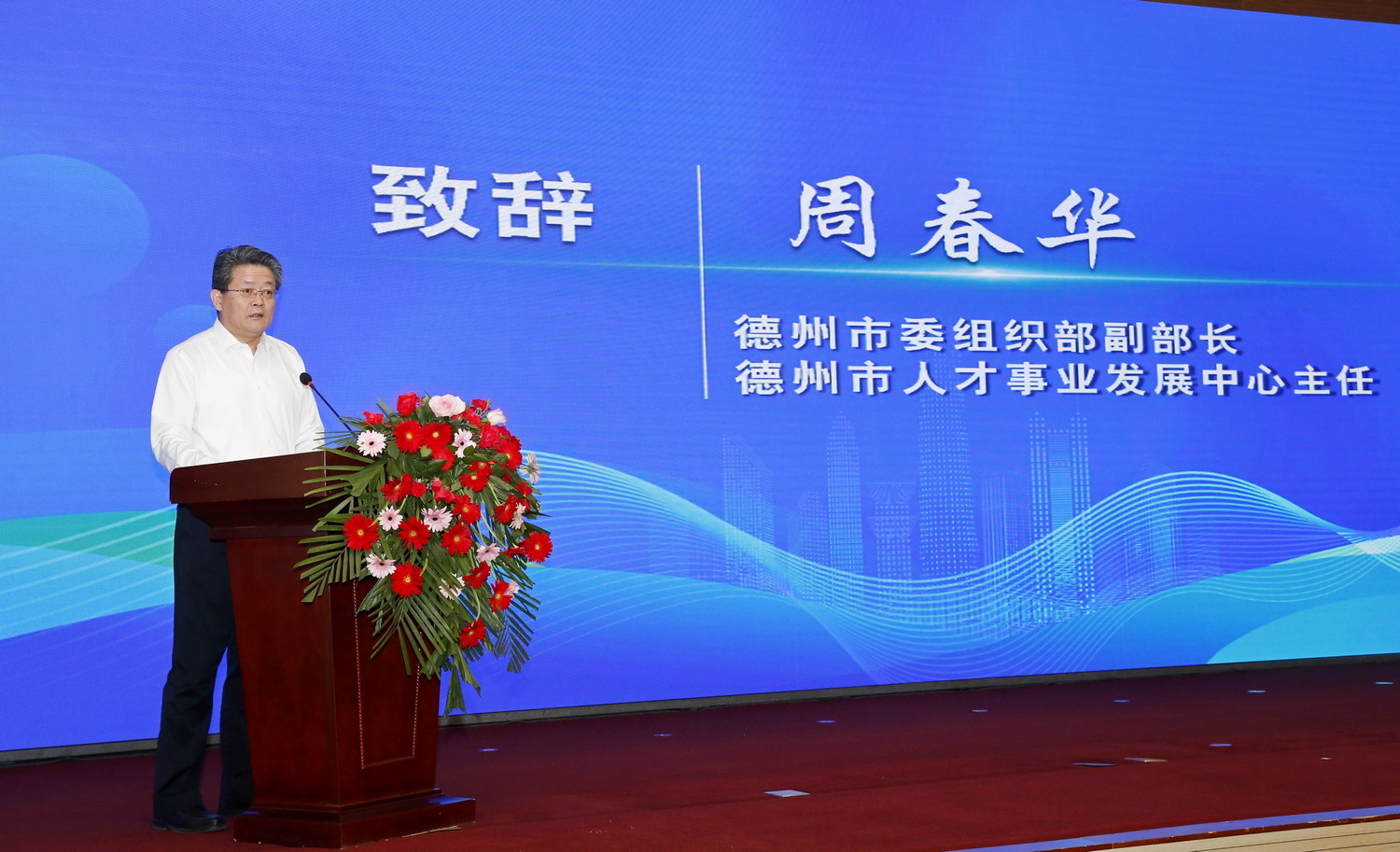 周春华致辞,他代表德州市委组织部、市委人才工作领导小组办公室,对校地双方合作签约表示热烈祝贺。他指出,人才是第一资源,创新是第一动力。市委、市政府牢固确立人才引领发展的战略地位,深入推进“四链”融合发展,全力支持校地校企合作,人才引领驱动高质量发展效能不断提升。此次beat365官方网站与武城合作签约,联合推进高端人才引育、科技成果转化、平台载体建设,既是武城县发展进程中的一次重要机遇,也是德州市校地合作的又一成功范例,必将对全市“四链”融合发展起到重要示范带动作用。