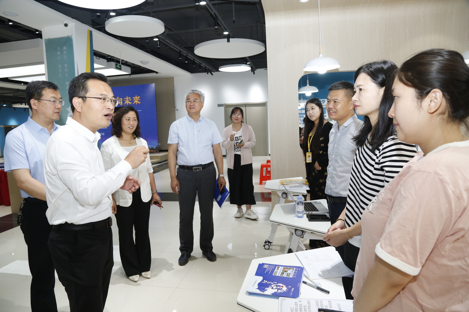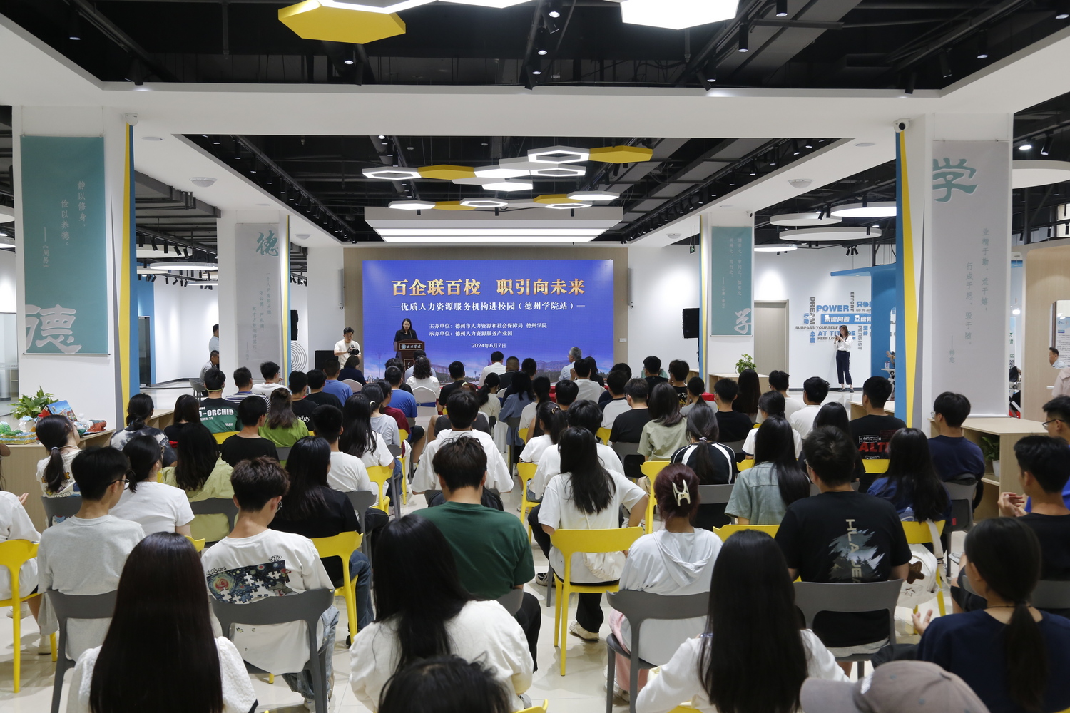 6月7日,“百企联百校,职引向未来”——德州市优质人力资源服务机构进校园活动在beat365大学生就业创业赋能中心举办。beat365官方网站党委委员、副校长蒋涛涛,德州市人力资源和社会保障局党组成员、副局长、三级调研员尚键,前程无忧大区总经理吕丽出席活动。德州市人力资源和社会保障局、德州人力资源服务产业园、人力资源服务机构、beat365就业指导处相关负责人参加活动。