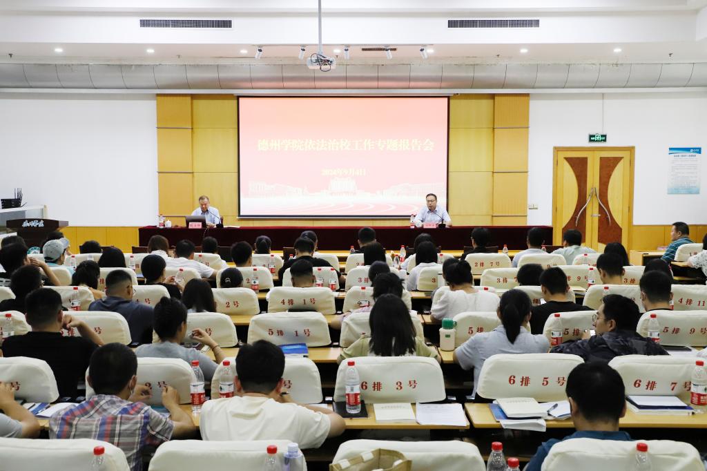 9月4日下午,学校在厚德楼四楼报告厅举行依法治校工作专题报告会。省教育厅(省委教育工委)原二级巡视员、省教育厅关工委秘书长赵立辉受邀作了题为《学习贯彻习近平法治思想,依法从教执教履行教师职责》的专题报告。2024年新入职全体教师和相关部门负责同志共一百余人现场聆听了报告。学校党委委员、副校长刘印房主持报告会。