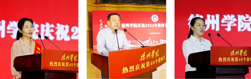 教师代表刘英华、荣退教师代表于清东、新入职教师代表李伟分别发言。新入职教师进行集体宣誓。学生为受到表彰的教师献花。