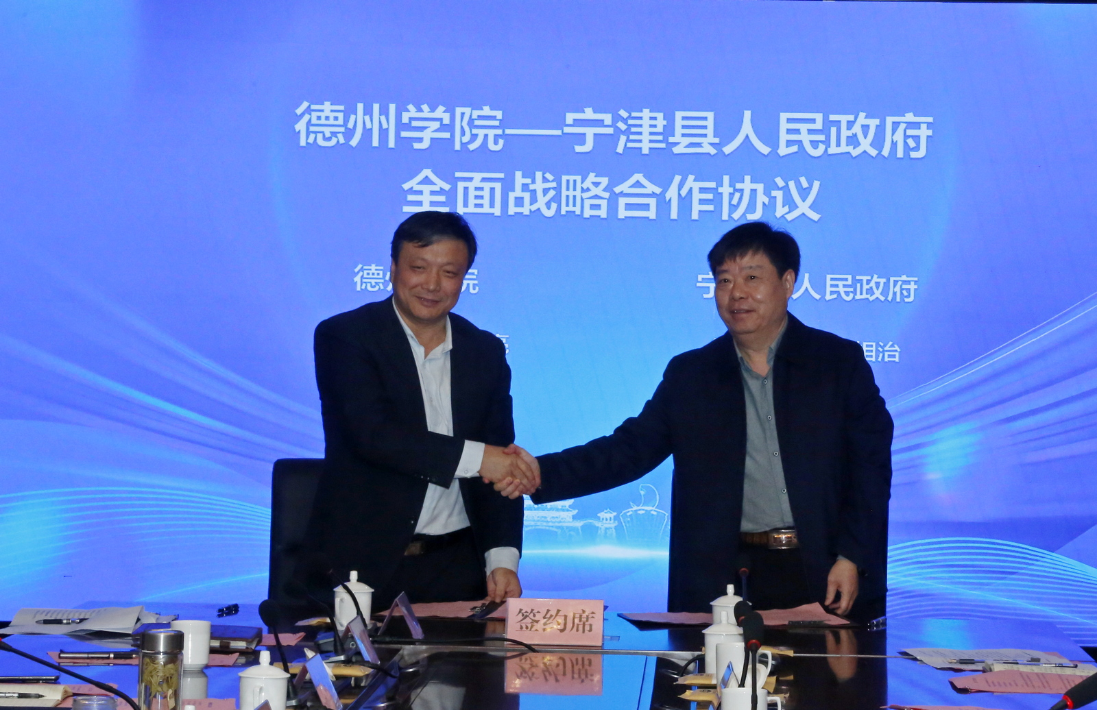 10月24日,学校与宁津县人民政府校地战略合作签约仪式在宁津县举行。校党委书记吴君,党委委员、副校长李甲亮;宁津县委书记高善玉,县委副书记、县长张健捷,县领导刘相治、宋光林、张广源、李荣兴、苏海云出席签约仪式。