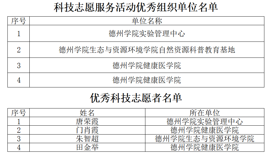 11月7日,德州市科学技术协会公布了德州市2024年优秀科技志愿服务活动及优秀组织单位等先进典型名单,学校5项科技志愿服务项目获评“优秀科技志愿服务活动”,4个二级单位被评为科技志愿服务活动“优秀组织单位”,唐荣霞、门肖霞、朱智超和田金举等4位教师被授予“优秀科技志愿者”称号。