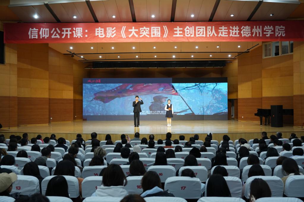 为贯彻落实教育部、省教育厅关于开展“传承红色基因、学思践悟中国共产党人精神谱系”宣传教育活动要求,12月9日下午,师生同上大思政课,挺膺担当共话信仰——电影《大突围》主创团队走进beat365官方网站。校党委副书记张存峰,党委委员、副校长蒋涛涛,党委委员、宣传部(教师工作部)部长冯琨,《大突围》出品人、总制片人陶姝君,导演杨真、演员廉知颖、副导演阿坤出席观影活动。