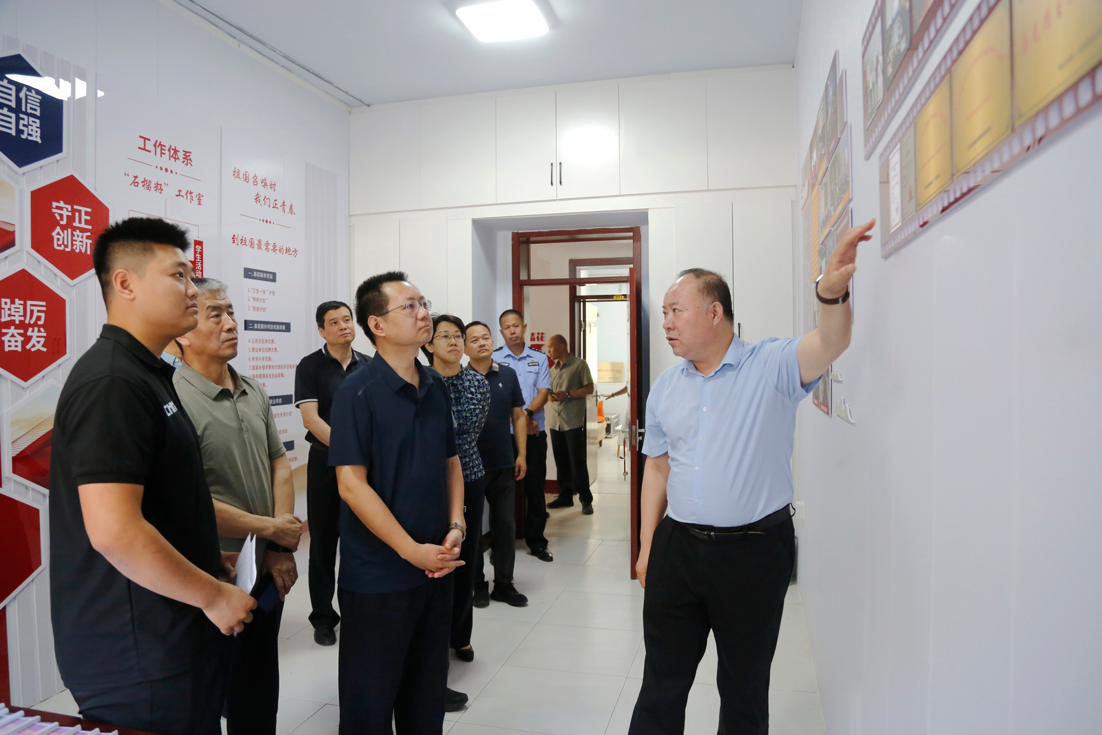 兰善文在考察石榴籽工作室和校园警务室后,对学校在促进民族团结和维护校园安全稳定方面取得的成效给予了充分肯定。他指出,从政治高度深刻认识校园安全稳定工作的极端重要性,以最高标准、最严要求、最实举措推动各项安全防范措施落地见效。要着力构建高效的情报信息网络,强化意识形态阵地建设,确保及时预警和处置各类风险隐患。同时,要重点完善由辖区派出所牵头,公安政保、反恐等多警种参与的警校联动长效机制,为学校高质量发展提供全方位安全保障。
