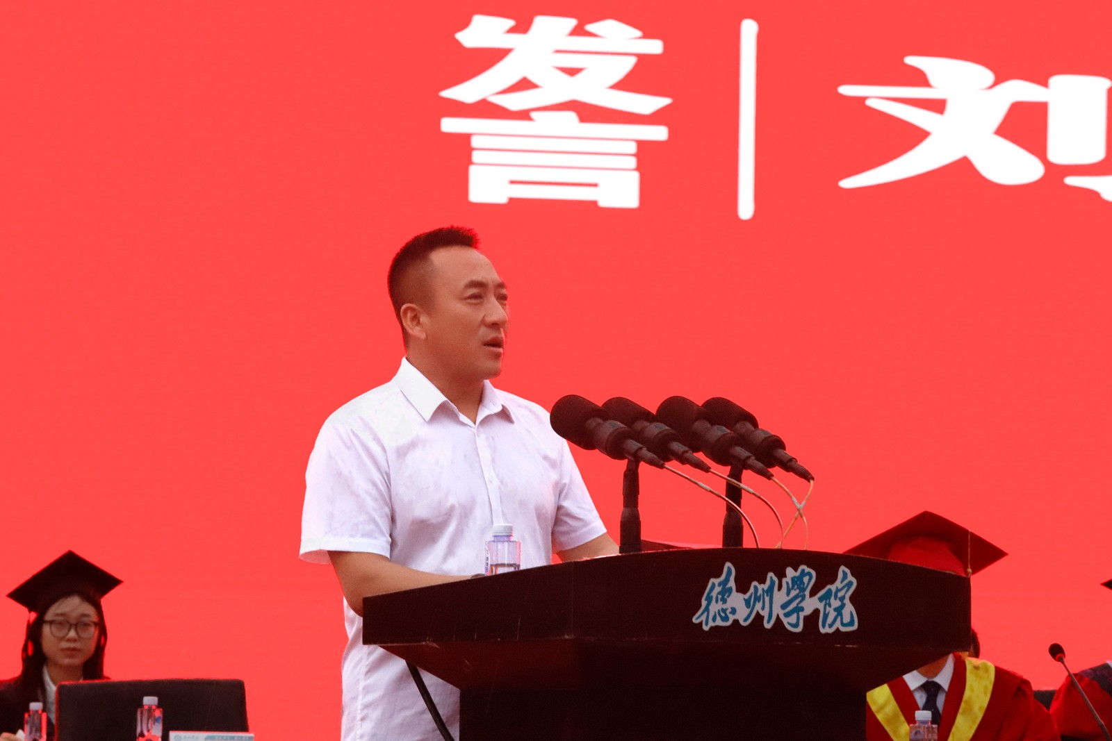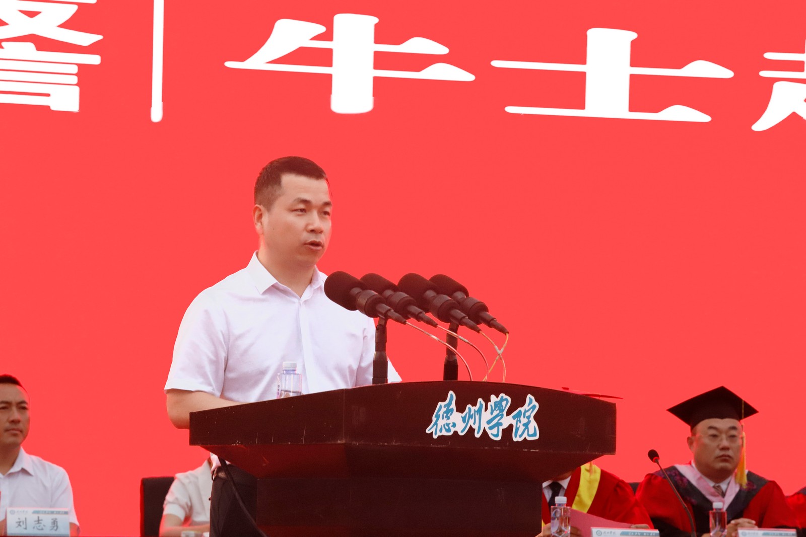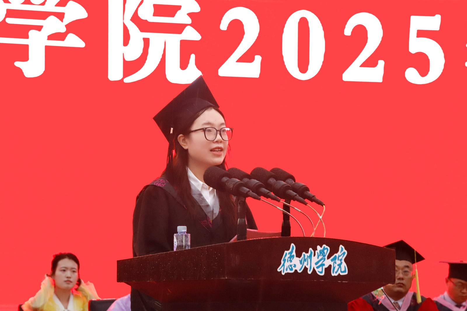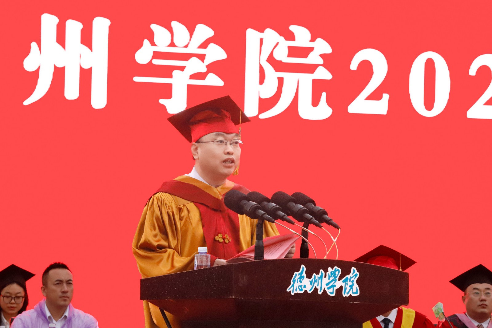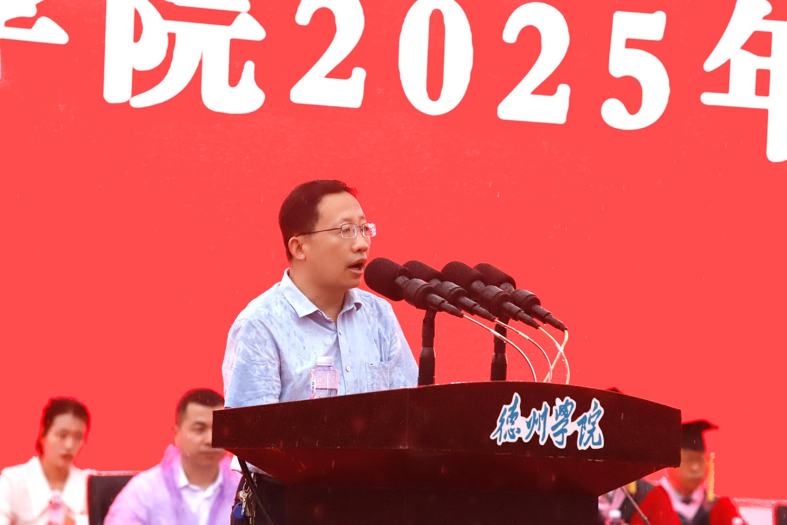 赵长林作题为“大力弘扬德院精神,把青春奋斗融入强国复兴新征程”的讲话。他代表学校向顺利完成学业的同学们表示祝贺,向为学生成长成才辛勤付出的广大教职员工及学生家长,致以崇高的敬意和衷心的感谢。他说,四年来,同学们践行“崇德启智、励志博学”的校训,把青春奋斗融入强国复兴伟业;涵养“勤学善思、知行合一”的学风,交出不负韶华的青春答卷。 赵长林勉励毕业生,要做有远大理想的青年人,唯有扎根伟大时代、树立远大志向、拥有强大的自信和意志力、锤炼过硬本领才能成功、才会成功;要做有责任担当的青年人,只要坚定不移听党话、跟党走,做有理想、敢担当、能吃苦、肯奋斗的新时代好青年,在推进强国建设、民族复兴伟业中有责任担当、有奉献作为,就会有光辉的前程和事业的成功;要做善于终身学习的青年人,永远保持对世界和未来的好奇心、对知识的渴望,在社会的大课堂里不断更新知识结构,提升面向未来的核心素养与竞争力,在充满不确定性的激烈竞争中奋勇向前,去实现新的人生价值;要做求真务实的青年人,凭借实干与韧性,不驰于空想,不骛于虚声,从基层做起,从小事做起,在平凡的岗位上追求卓越,用勤劳的双手和智慧的头脑创造出不平凡的精彩人生。