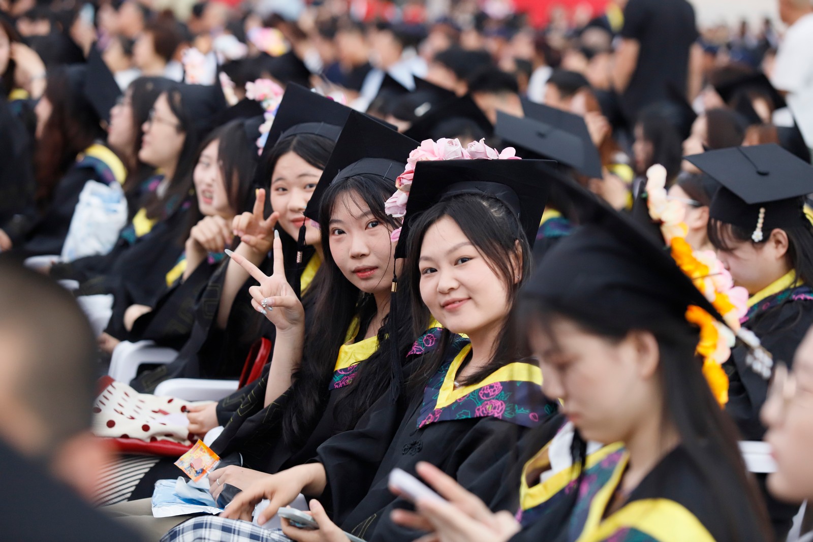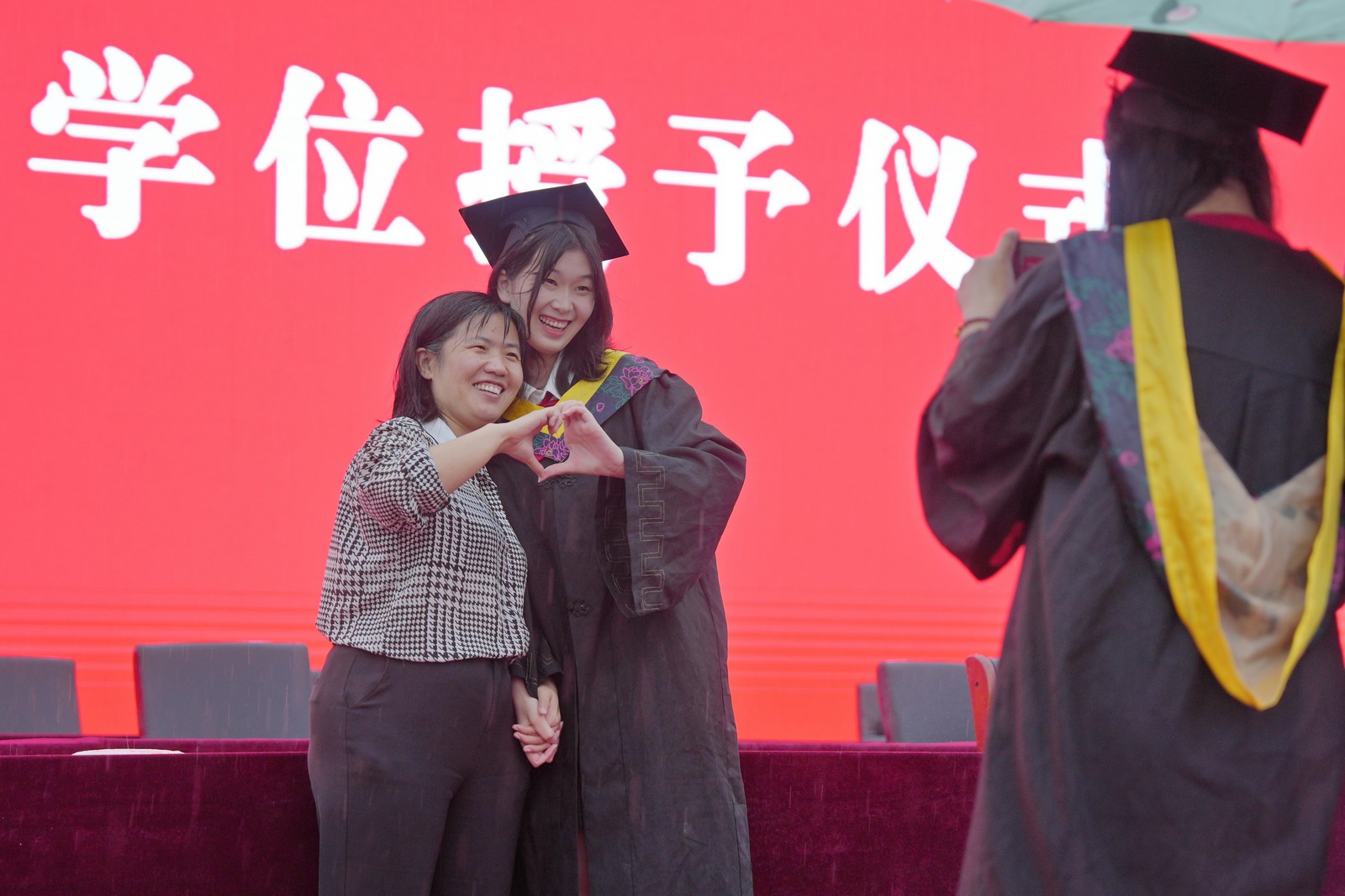 在学位授予仪式环节,党委委员、副校长、学位评定委员会副主席徐静宣读《关于授予2025届毕业生学士学位的决定》,校领导分别到各学位授予台为毕业生拨穗、颁发学位证书并合影留念。