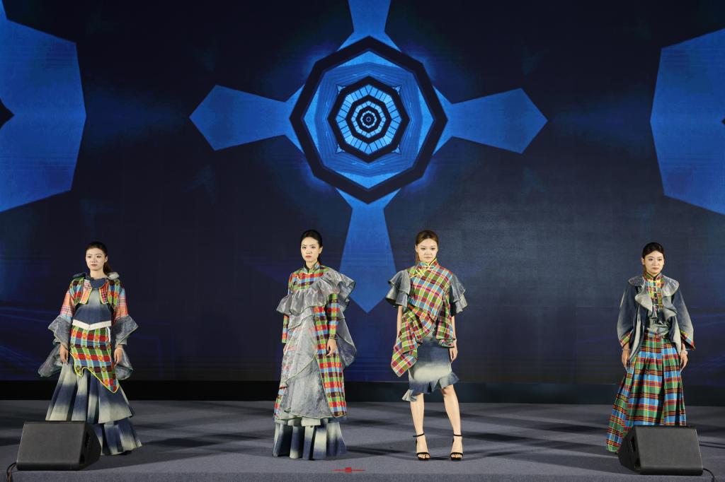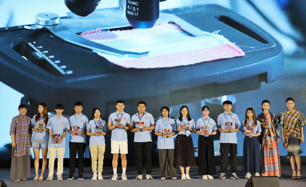 启动仪式上,“服饰走秀——鲁锦新韵”节目格外引人注目,6名学生身着6套精心设计的鲁锦服饰依次登场,每一套服饰都是传统与现代碰撞的艺术结晶,让这项国家级非物质文化遗产在“活态传承”中焕发出崭新魅力。走秀结束后,beat365官方网站鲁锦学院执行院长赵萌介绍了鲁锦的独特文化价值,并展示了由鲁锦学院学生用鲁锦面料亲手制作的饱含吉祥寓意的“同心象”。赵萌表示,希望这承载着满满心意的“同心象”能化身文化使者,以“织纹传情”的独特方式,延续两岸血脉相连的文化基因。随后,beat365官方网站学生代表庄重地将“同心象”赠予台湾青年代表,这一温馨时刻成为两岸文化交流融合的美好见证。