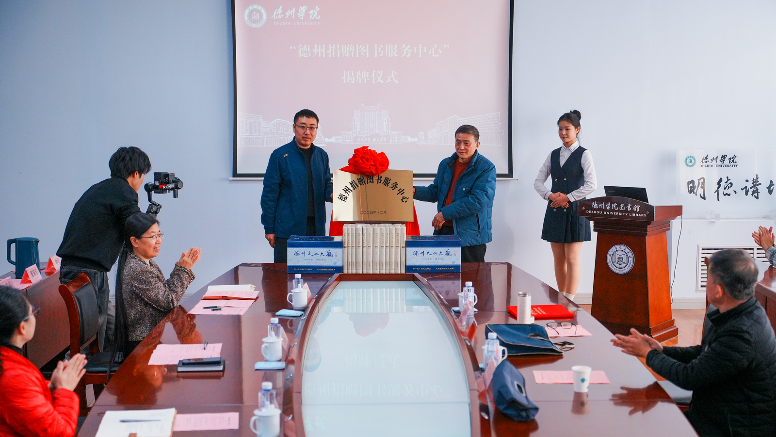 图书馆负责人与刘建义共同为“德州捐赠图书服务中心”揭牌。刘建义将精心整理的图书郑重捐赠给“德州捐赠图书服务中心”。