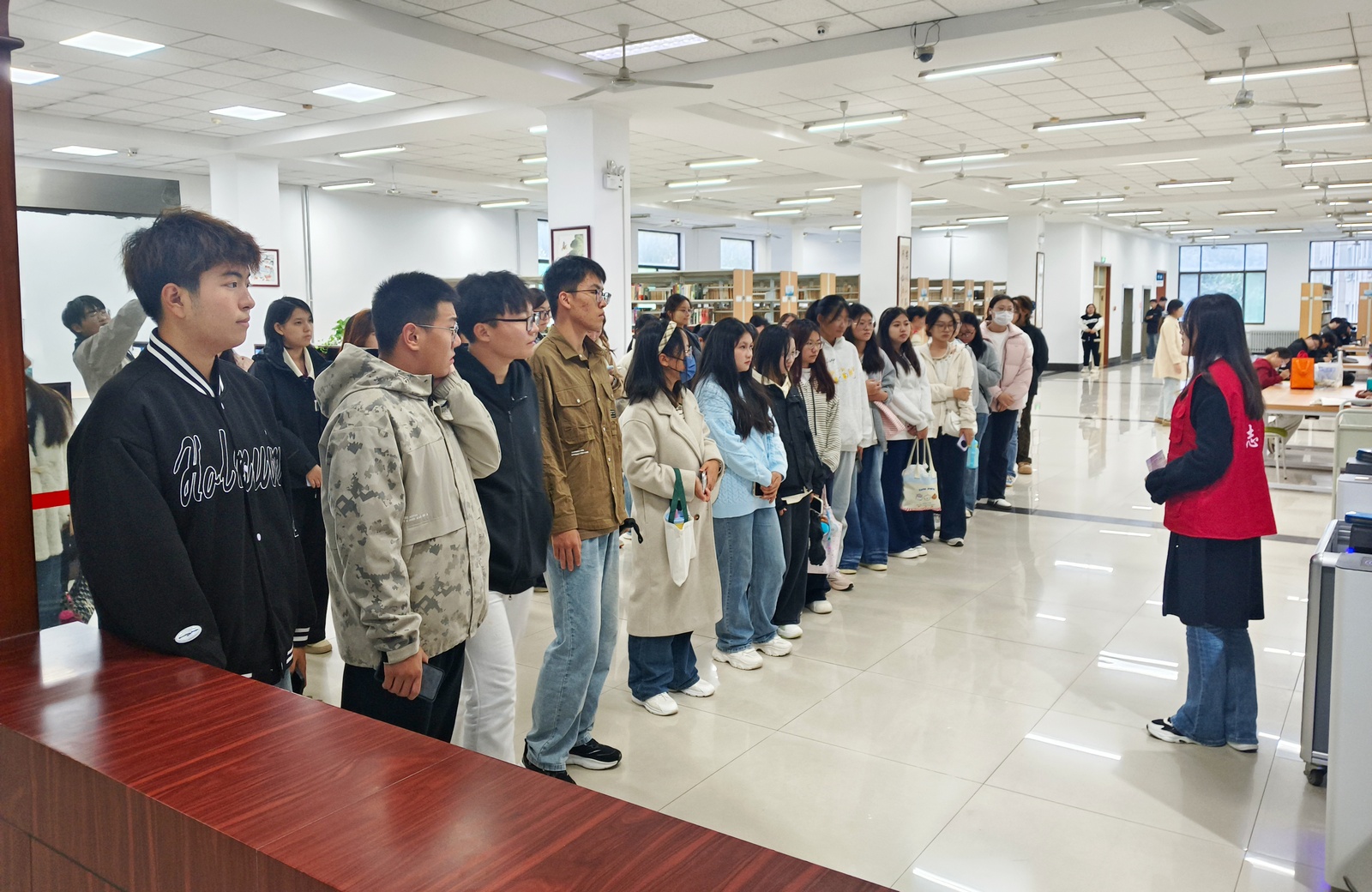 第二阶段是现场参观活动。让新生走进图书馆,体验阅读氛围。为确保参观教育质量,图书馆前期对参与讲解的学生馆员进行了系统培训,内容涵盖馆藏布局、资源特色、服务礼仪及常见问题解答,力求为新生提供专业、清晰的导览服务。参观过程中,讲解员们引导新生依次走进各学科藏阅室,详细介绍了不同区域的功能定位、藏书特点及开放时间。在社会科学、自然科学、文学艺术等专题阅览区,丰富的藏书和静谧的学习环境给新生们留下了深刻印象。借阅服务是新生关注的重点。讲解员演示了自助借还书设备的操作步骤,清晰讲解了图书查询、借阅规则、续借方式及逾期处理等注意事项,并特别提醒新生爱护图书、按期归还。本次入馆培训从讲解员培训到组织完成共历时一个多月,组织培训场次共计200余场。
