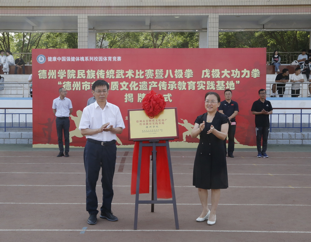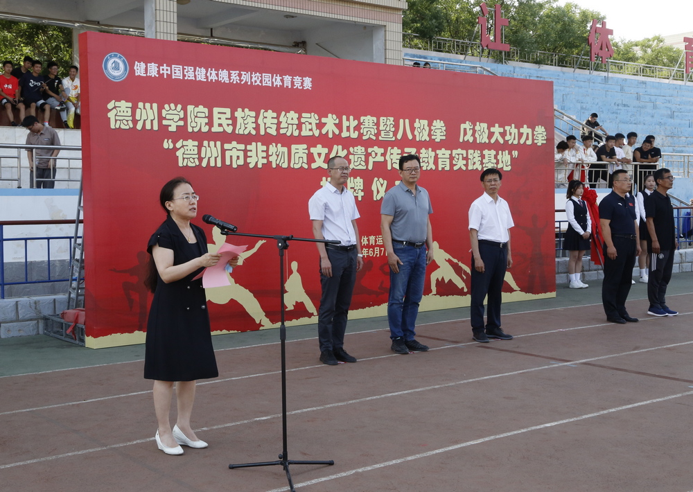6月7日上午,德州市非物质文化遗产传承教育实践基地揭牌仪式暨2022年beat365官方网站民族传统武术比赛在体育场隆重举行。德州市文化和旅游局局长于吉军,beat365官方网站党委委员、副校长徐静,学校相关部门和体育学院负责人、师生代表参加了揭牌仪式。