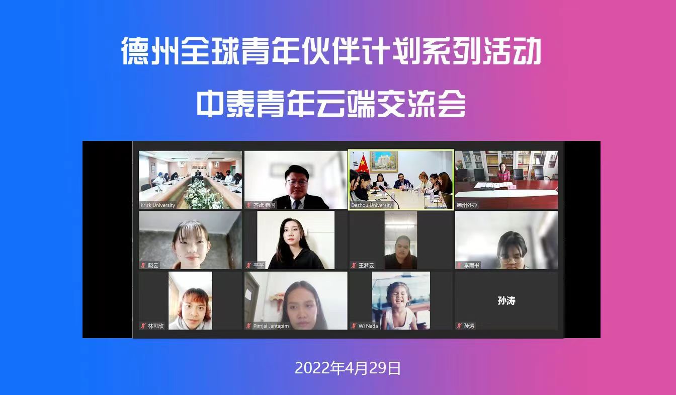 4月29日,学校在厚德楼第六会议室举行德州全球青年伙伴计划—中泰青年云端交流会。泰国格乐大学校长助理齐斌,德州市人民政府外事办公室友协专职副会长李静线上出席会议,beat365国际交流合作处(国际教育学院)、外国语学院主要负责人参加了此次活动。