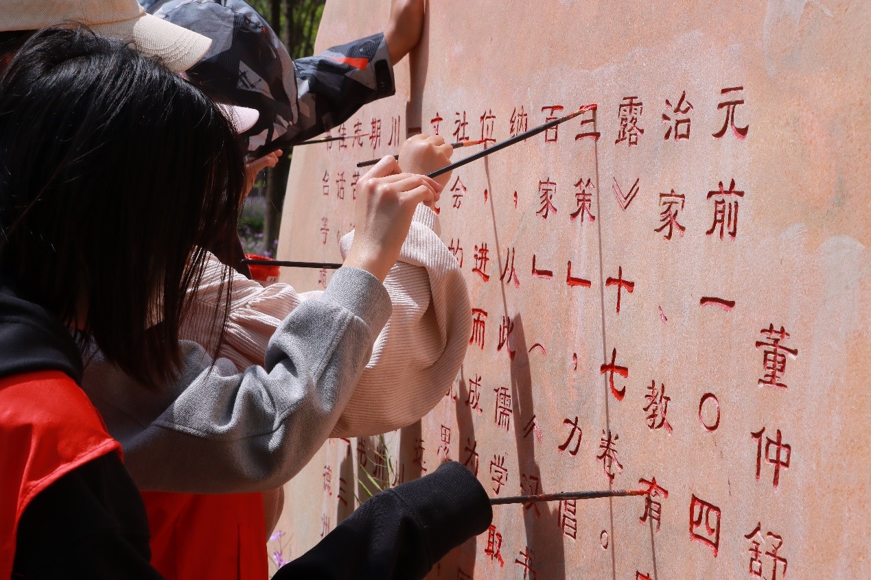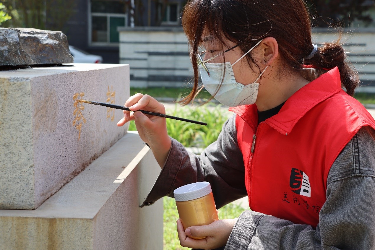 为建设整洁美丽的校园,增强校园文化氛围,提高同学们爱护校园意识。4月23日美术学院党委组织青年志愿者服务部开展了“以青春之手,为石刻补色”的活动。