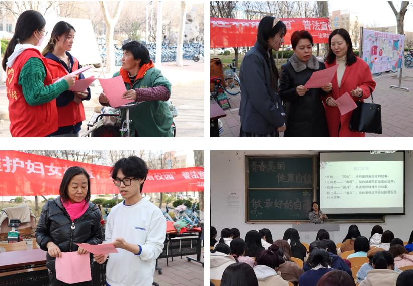 “怎样认识我们自己?”“为何成就我们自己?”“何以成就我们自己?”在博文楼0427教室里,法学院教工党员徐丽红博士与百余名女大学生们面对面分享“青春美丽 健康自信 做最好的自己”的巾帼故事,她以中国女排、中国女足、中国古典女性为例,阐述了新时代女性“强”“韧”“美”“柔”的多彩之美,并以法学专业角度,指导女生独立、自信、知性、智慧地成长为新时代、新女性。“《中华人民共和国妇女权益保障法》全文包括总则、政治权利、文化教育权益、劳动和社会保障权益、财产权益、人身权利、婚姻家庭权益、法律责任、附则共九章六十一条……”,在校园儒风广场,教工党支部与学生党支部开展“维护妇女权益 共建和谐校园”法律宣传。对校园女大学生、园林女工、餐厅阿姨等女性朋友逐条宣讲《中华人民共和国妇女权益保障法》法律法规,普及妇女权益受到侵害时寻求救助方法和途径等知识,活动发放宣传手册300余份,现场解答咨询问题30余条,帮助女性利用法律武器维护自身权益,提升全民妇女权益保障意识。此外,法学院还利用课余时间,开展了内容实用、形式新颖的女性健康保健座谈会及参与度高的趣味运动会。全体女教工纷纷表示,充分感受到了节日的温馨与快乐,激发了热爱本职、教书育人的自豪感和责任感,今后将继续辛勤耕耘、无私奉献、努力工作,为党和国家的教育事业贡献智慧力量。