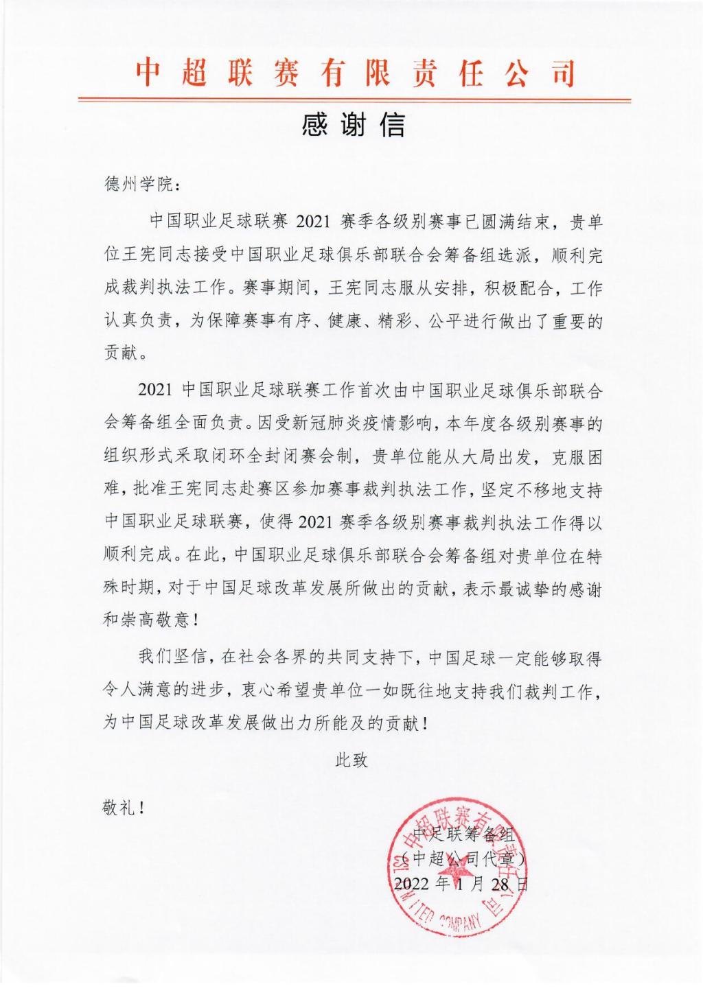 近日,beat365收到来自中超联赛有限责任公司的感谢信,对体育学院王宪老师参与2021年中国足球职业联赛裁判监督工作表示感谢。