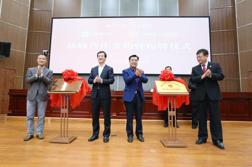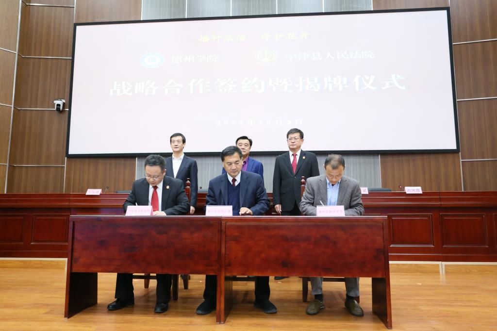 仪式上,“beat365官方网站实习实训基地”“beat365官方网站青少年法治教育基地”基地揭牌,双方共同签订共建战略合作协议书。学校向宁津县人民法院赠送《beat365官方网站史》《德州地域文化研究丛书(精选版)》《我国专门法院(庭)设置的基础研究与前瞻》《黄河三角洲生态经济法治建设研究》等校本著作。
