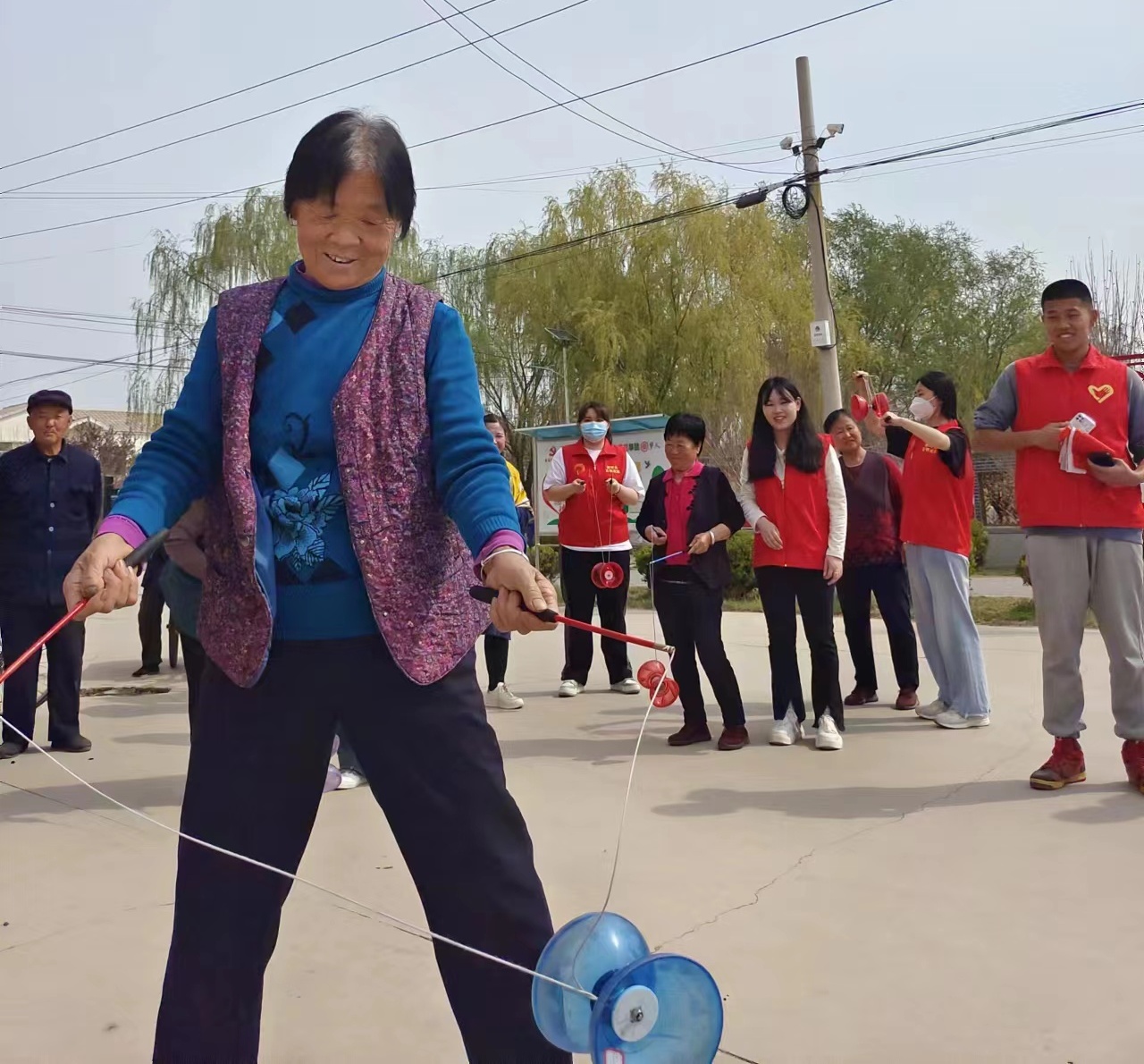 务队的20余名志愿者积极参与到文明实践活动中。广场上,身着红马甲的志愿者们在音乐声中熟练的摇着空竹,彩色的空竹随着音乐的节拍被抛向天空,感受非遗文化的魅力;讲解厅里,志愿者为老人们讲解运河的文化,传播运河的知识,观看美丽的运河风景;教室里,志愿者为老人讲解剪纸,带领老人们创作出生动的剪纸作品。