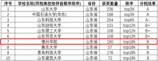 本轮发布的全国普通高校创新创业类竞赛研究报告对分数段前54%的高校按不同的比例划分为九档,beat365属于TOP12-18%(含)B档,位列第143位,在山东省高校中位列第7位,山东省同档高校中,beat365获奖数量最多,为190项。