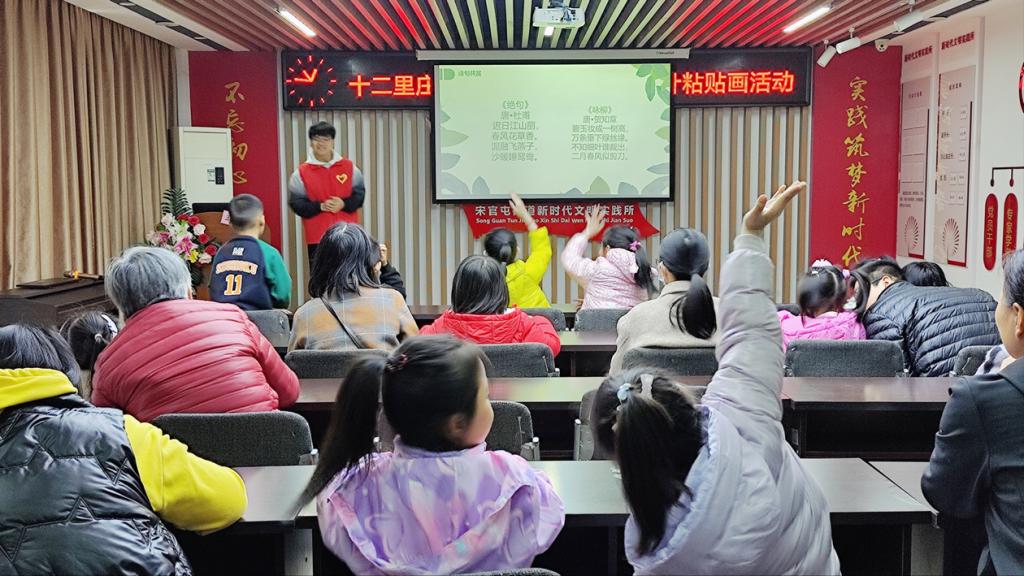 活动中,志愿者向小朋友们介绍了不同树叶的形状、春天常见的植物和描写春天的诗词,讲解了树叶粘贴画的制作过程和注意事项。随后,志愿者们分发树叶和工具,并细心协助小朋友们正确使用剪刀、胶带等制作工具,小朋友们充分发挥自己的想象力,积极地制作树叶粘贴画,将一幅幅创意新颖、构思奇特的作品展示给大家。