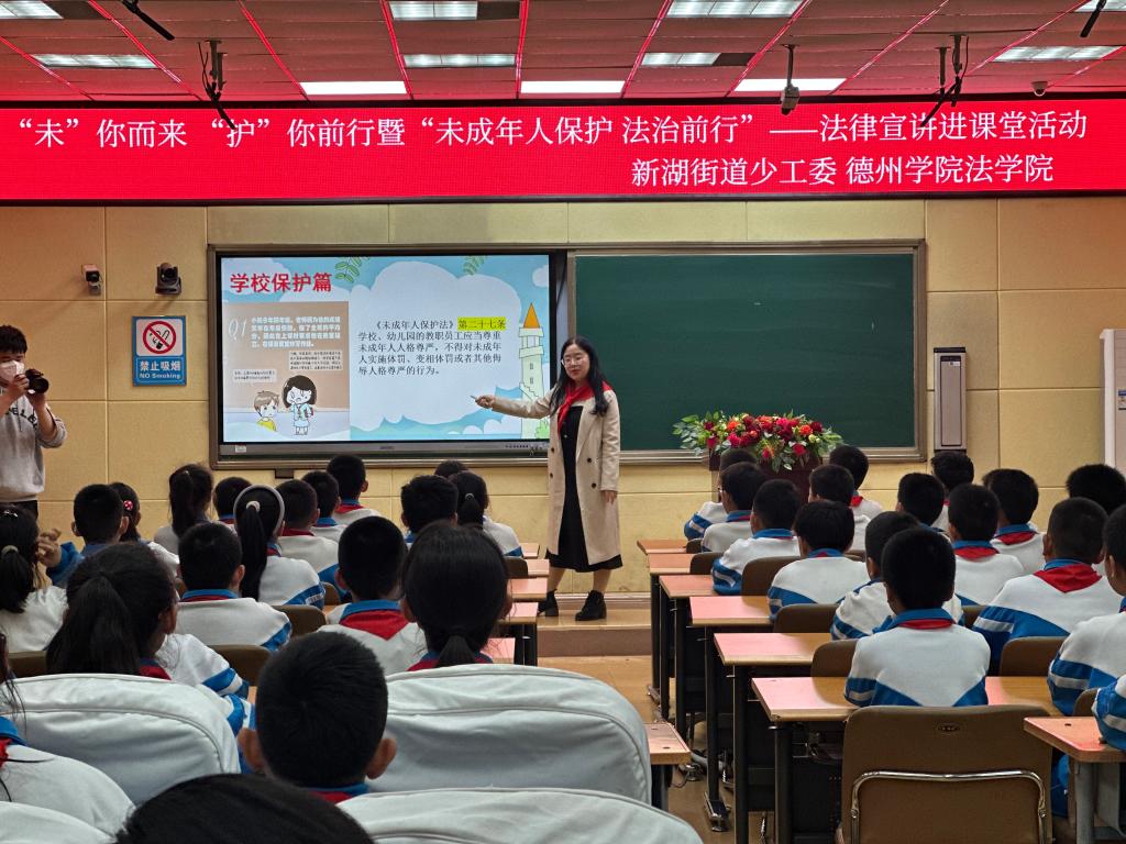 4月26日,法学院联合新湖街道少工委、新湖北路小学开展未成年人保护法法律宣讲进校园活动。法学院教师田莹莹博士以“我们该如何保护自己?”为题,为新湖北路小学孩子们普及了《中华人民共和国未成年人保护法》《预防未成年人犯罪》等关于未成年人保护相关的法律法规,活动现场同学们参与热情高涨,踊跃发言,积极互动,达到了良好的法治宣传教育目的。