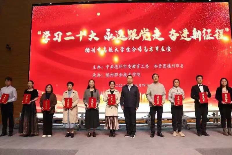 5月4日,由中共德州市委教育党工委、共青团德州市委主办、德州职业技术学院承办的“学习二十大 永远跟党走 奋进新征程”德州市高校大学生合唱艺术节展演活动在德州职业技术学院举行。音乐学院48名学生代表组队参加。吴丽老师担任指挥,张利鑫老师进行钢琴伴奏。