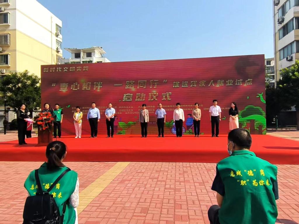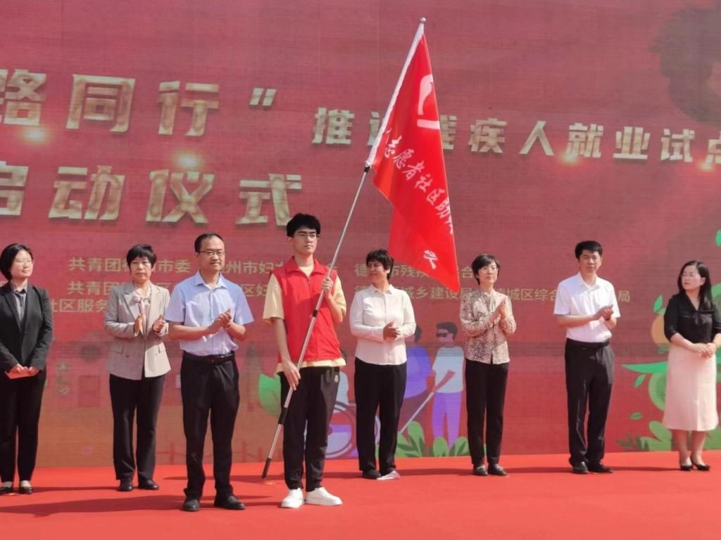 5月16日上午,由共青团德州市委、德州市精神文明建设委员会、德州市残联、德州市总工会、德州市妇联联合举办的德州市青年志愿者社区助残服务队授旗仪式在德城区嘉诚景园举行。beat365青年志愿者联合会服务队参加授旗仪式,并接受青年社区助残服务队队旗。