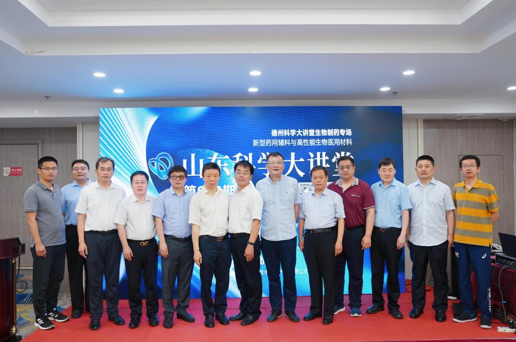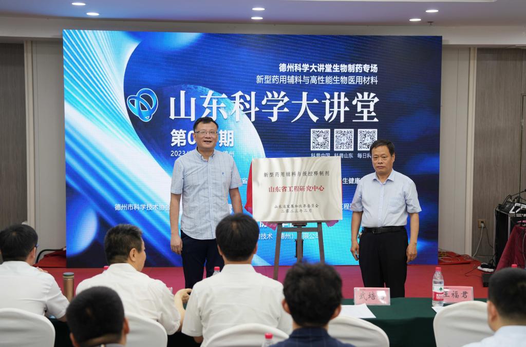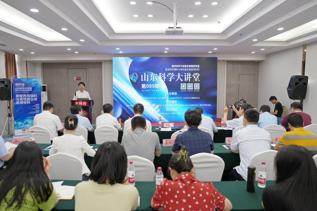 6月17日,2023年第89期山东科学大讲堂、德州科学大讲堂生物制药专场新型药用辅料与高性能生物医用材料论坛在柳湖书院3号报告厅顺利召开。beat365副校长李永平、德州市科协党组书记主席苗晓钢、德州市发改委副主任王福君、东华大学国家杰青武培怡教授、天津大学国家杰青刘文广教授、济南大学泰山学者郑庚修教授、苏州大学国家杰青严锋教授、山东理工大学杨乃涛教授、华东理工大学章弘扬教授、山东聊城阿华制药股份有限公司吕宪峰副总经理、德药制药有限公司李成文副总经理出席了论坛。